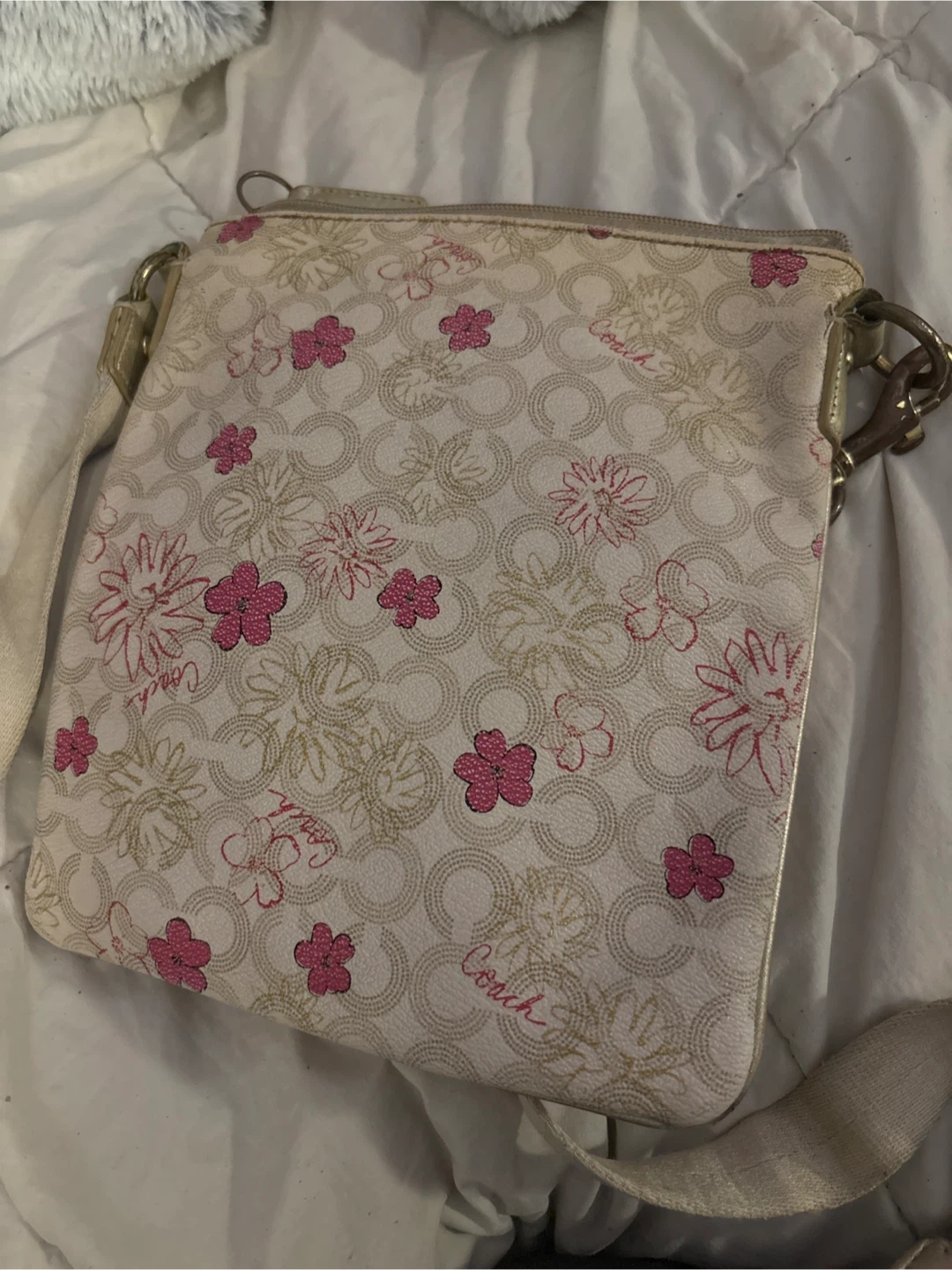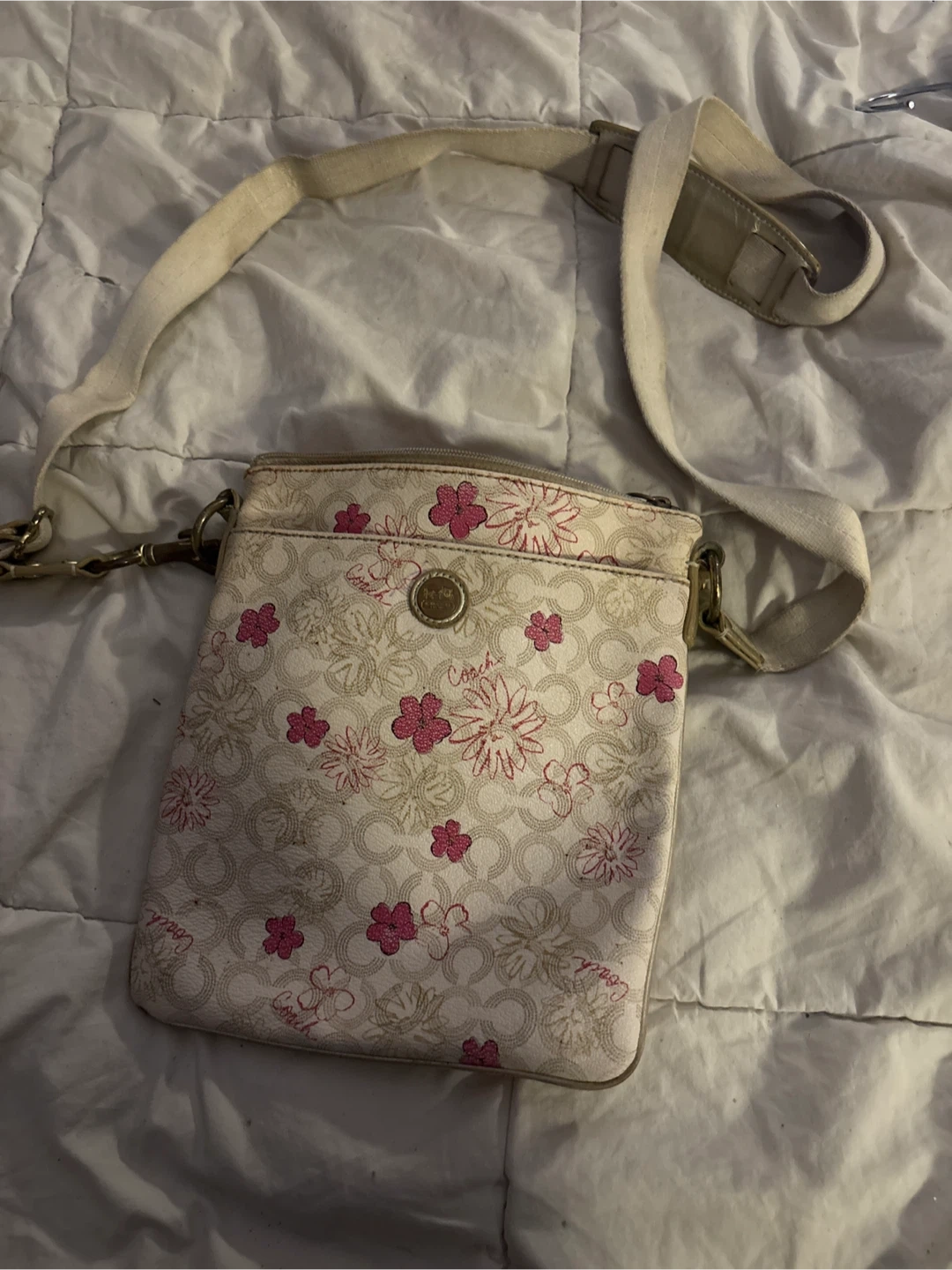 Selling a cute Coach crossbody bag with a floral pattern! It's perfect for carrying your essentials when you're on the go. There are some signs of wear, but it's still in good condition for everyday use