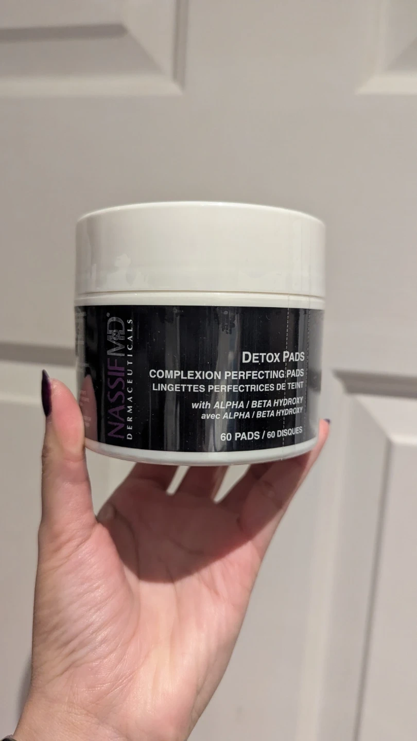 Selling a container of NassifMD Detox Pads, which includes 60 pads. These are complexion perfecting pads that contain alpha and beta hydroxy acids to help detoxify your skin.