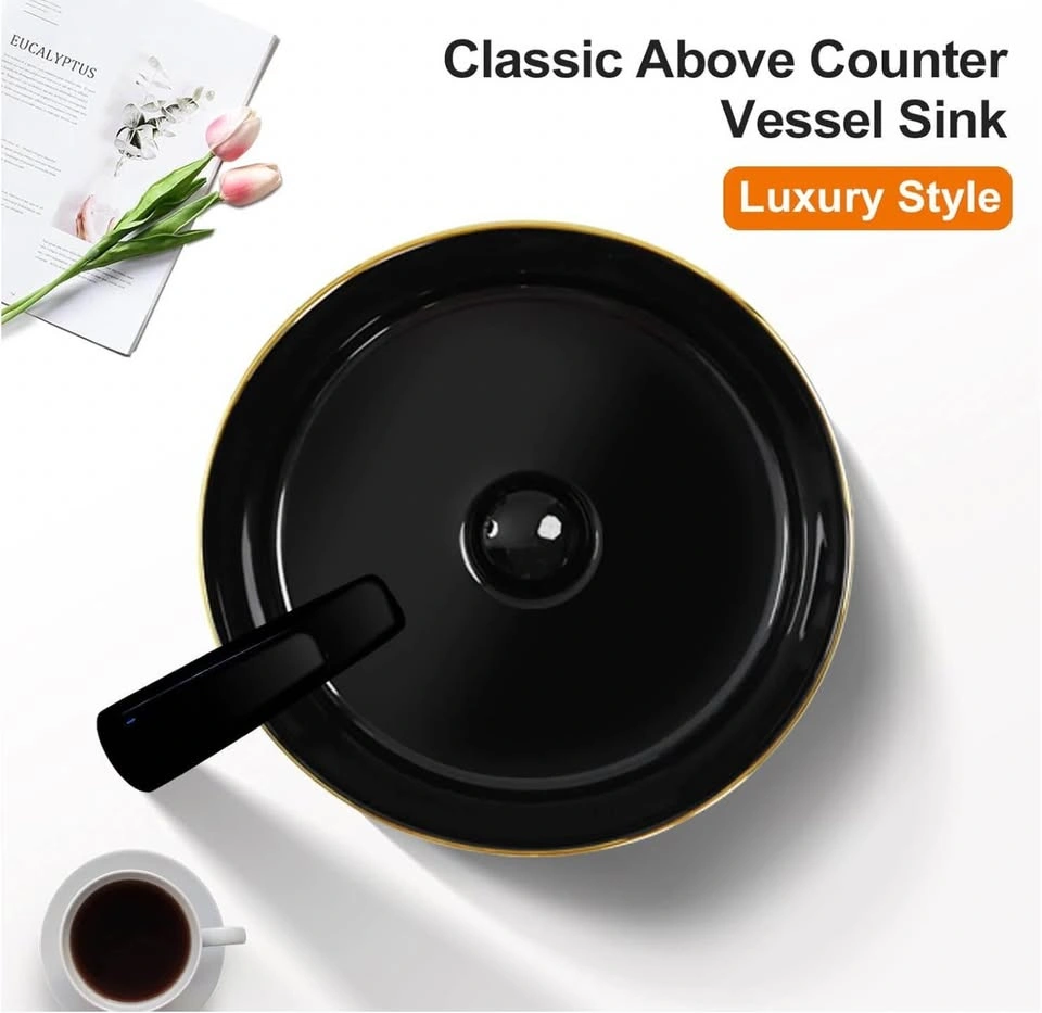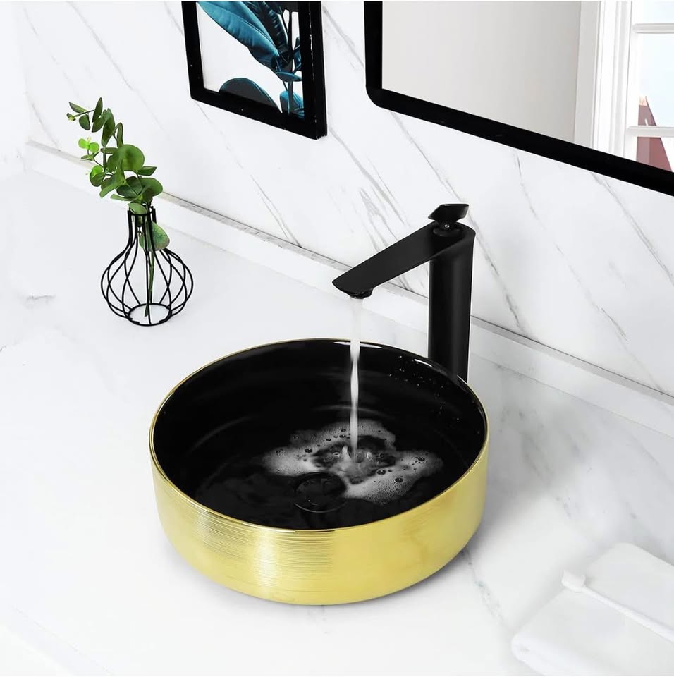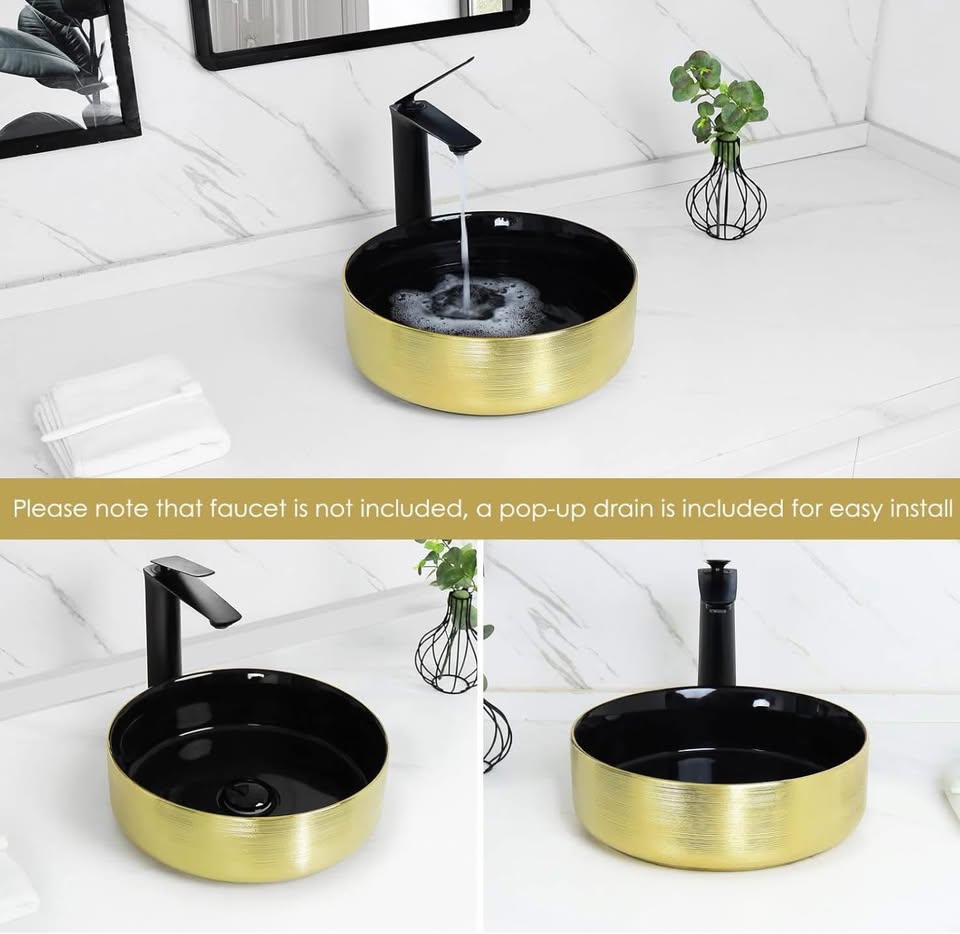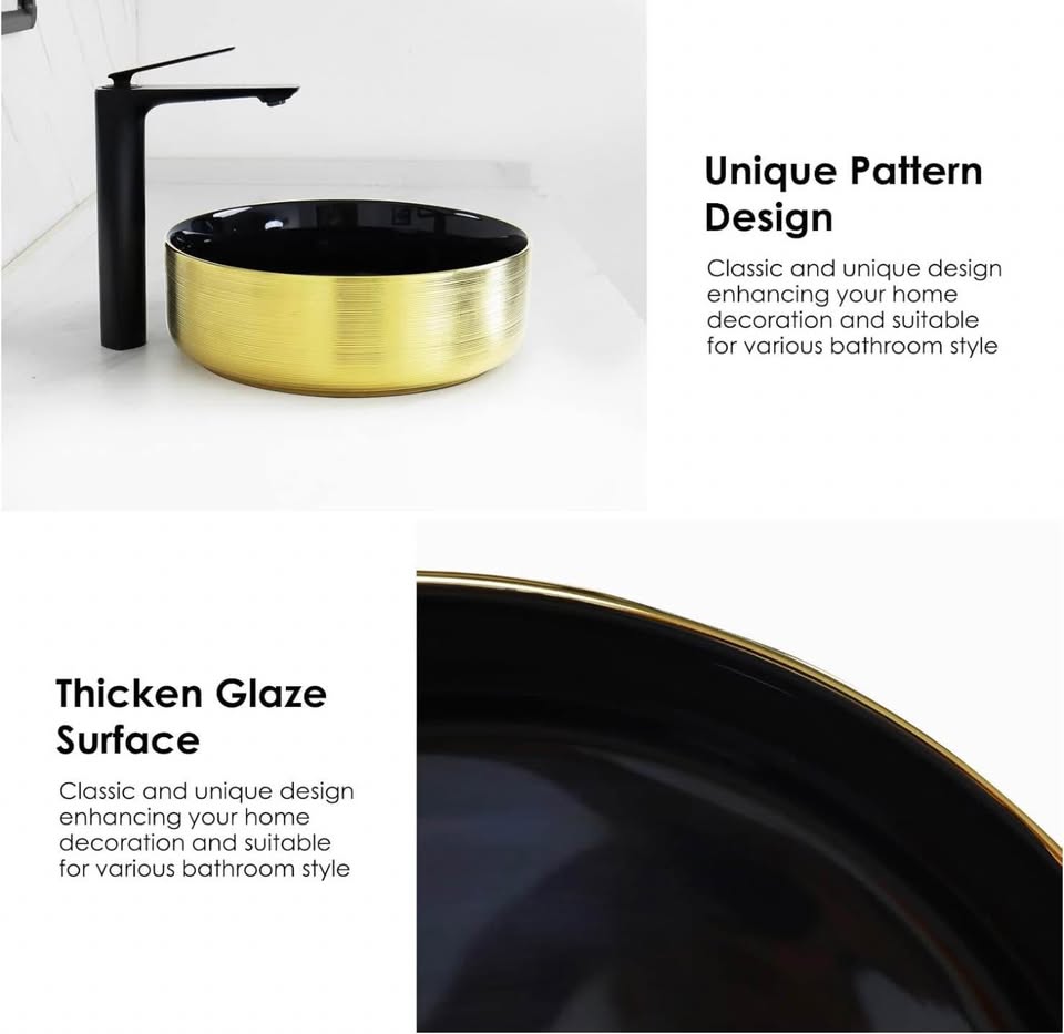 Stylish & Modern Design: Elegant black and gold round vessel sink. Perfect for home, hotel, or office use.