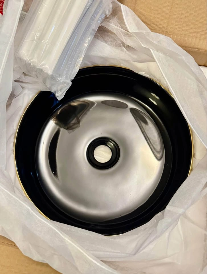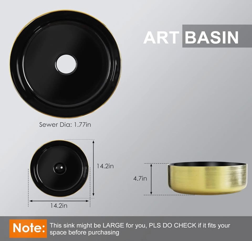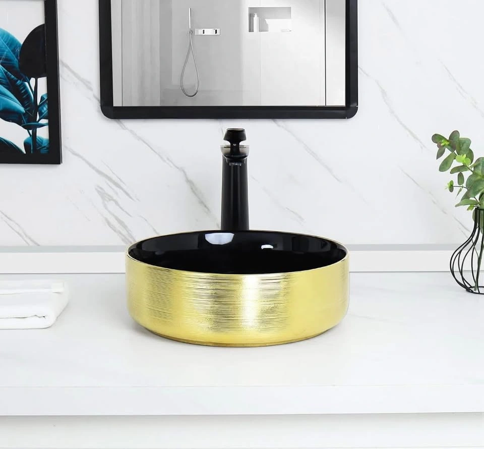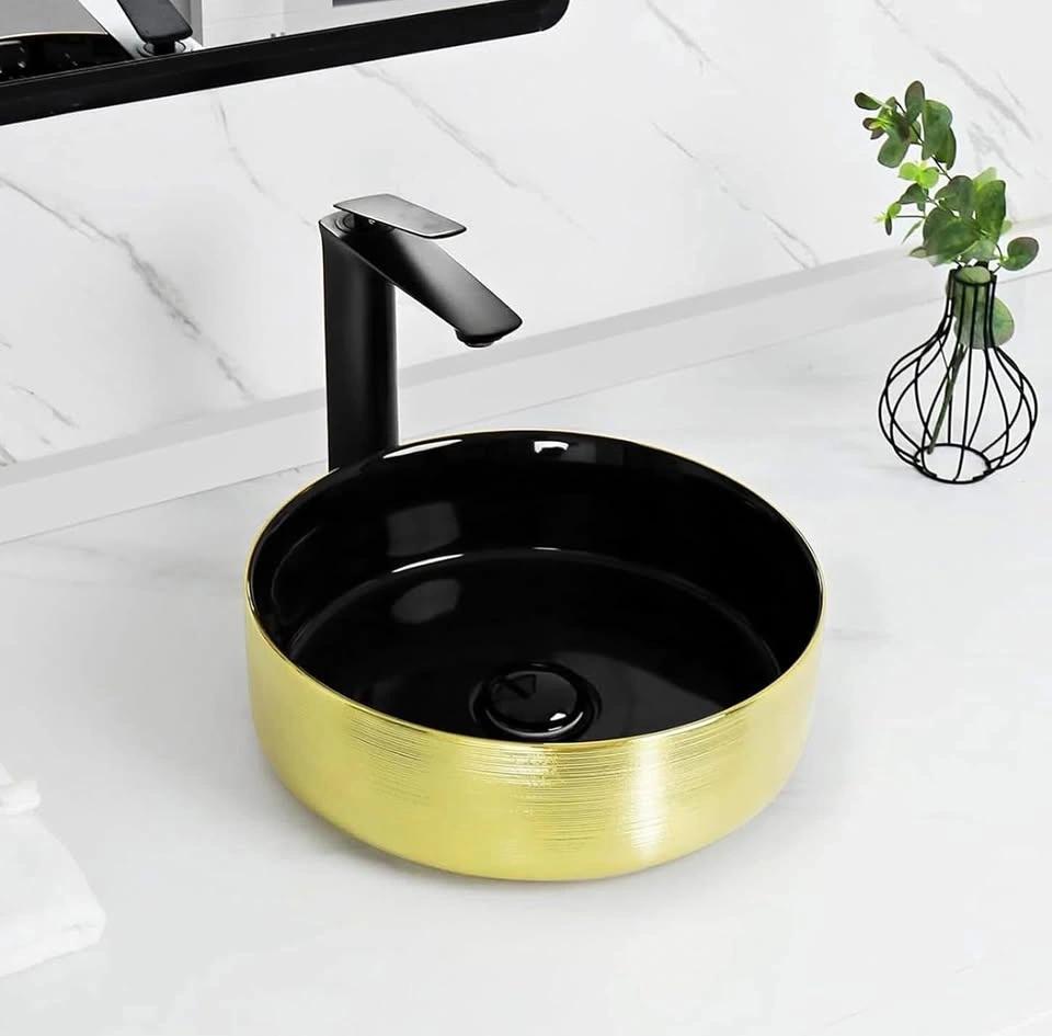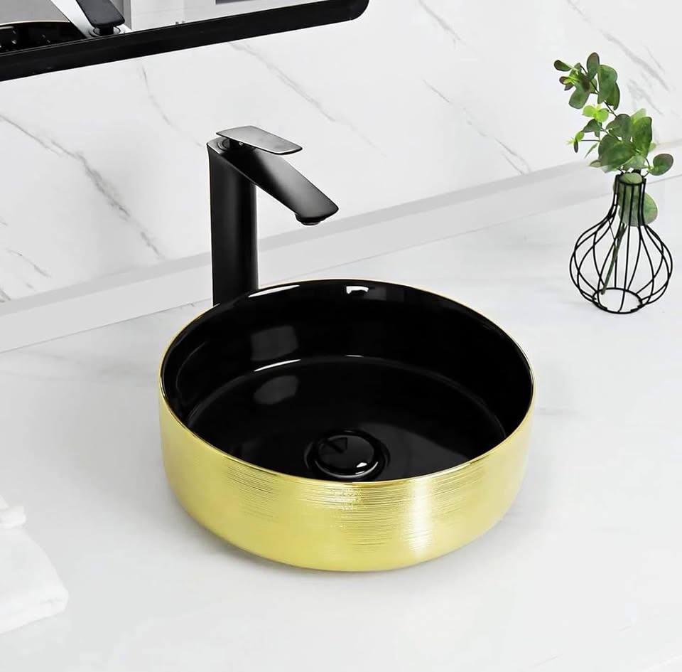 Stylish & Modern Design: Elegant black and gold round vessel sink. Perfect for home, hotel, or office use.