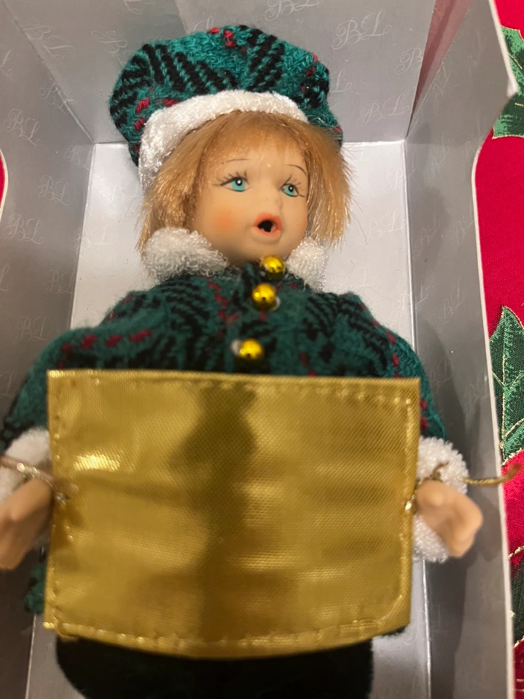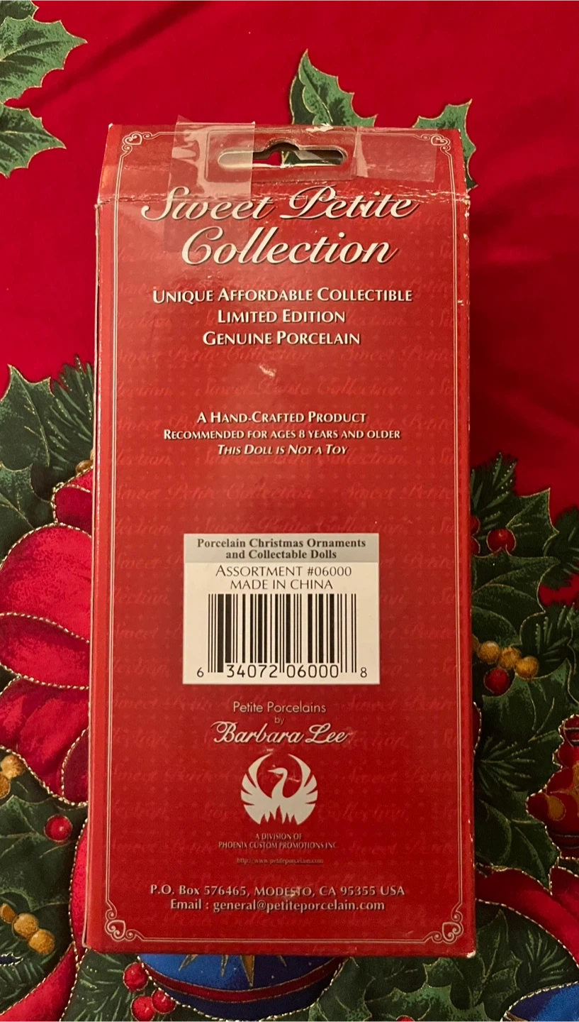This is a charming, petite porcelain doll from the Barbara Lee 'Sweet Petite Collection', featuring 'Zachary' in a festive green plaid outfit, complete with a hat and gold sash. Although this collectable is in used condition, it has been carefully stored in its original box, which is included, ensuring it remains a delightful piece for collectors or as a unique decorative item.