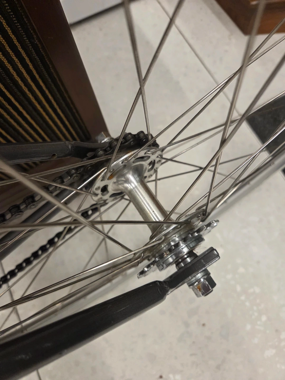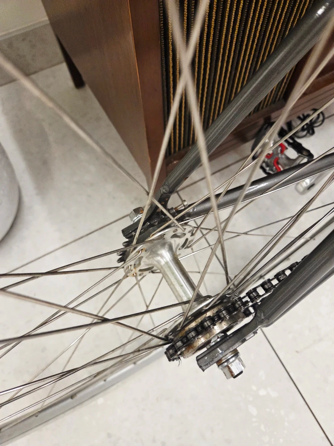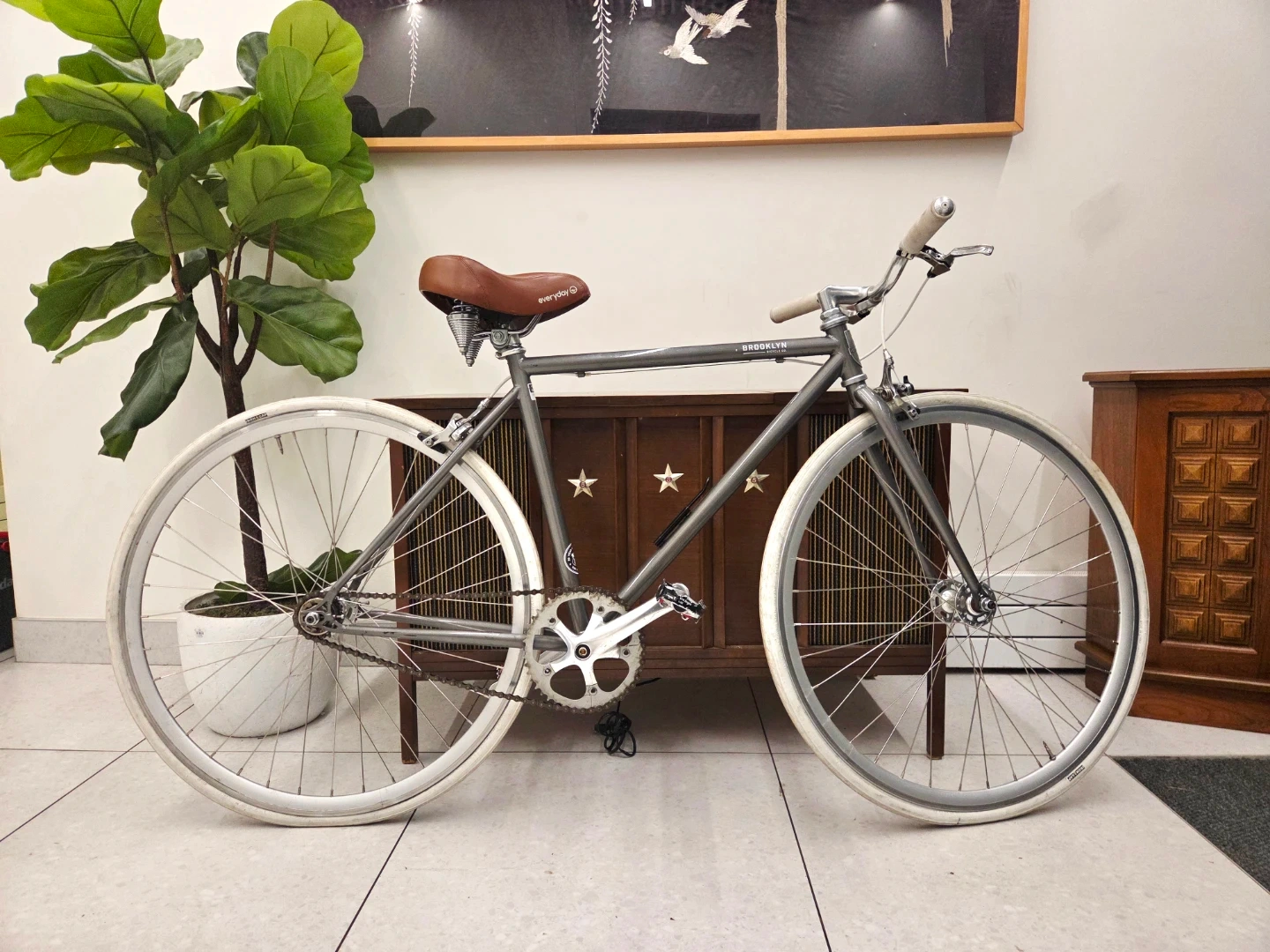 The bike is equipped with a flip-flop hub, allowing it to be ridden as either a fixed gear or a single-speed freewheel.