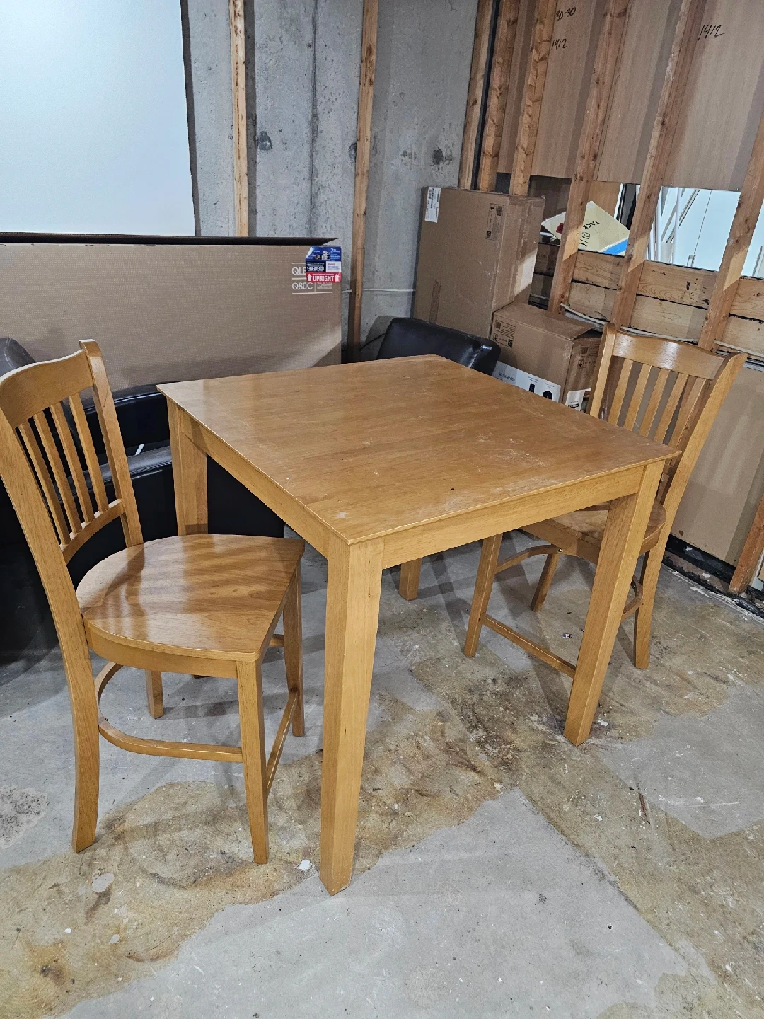 Selling a wooden dining table with two matching chairs. It's a simple and sturdy set, perfect for a small dining area or kitchen. The table has a square top and the chairs have a classic design. They're in good condition and ready for a new home!