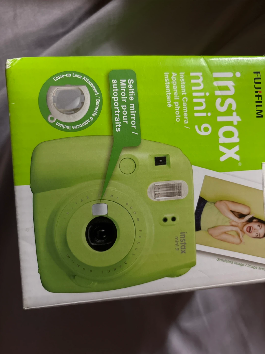 Selling a Fujifilm Instax Mini 9 instant camera in lime green! It comes with the original box and includes a hard strap, close-up lens attachment, stickers, an AA battery, and the instruction manual.