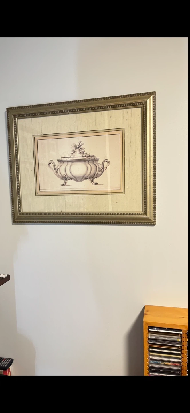 A framed print featuring a silver tureen. The frame is gold coloured and the print would make a nice addition to any room!