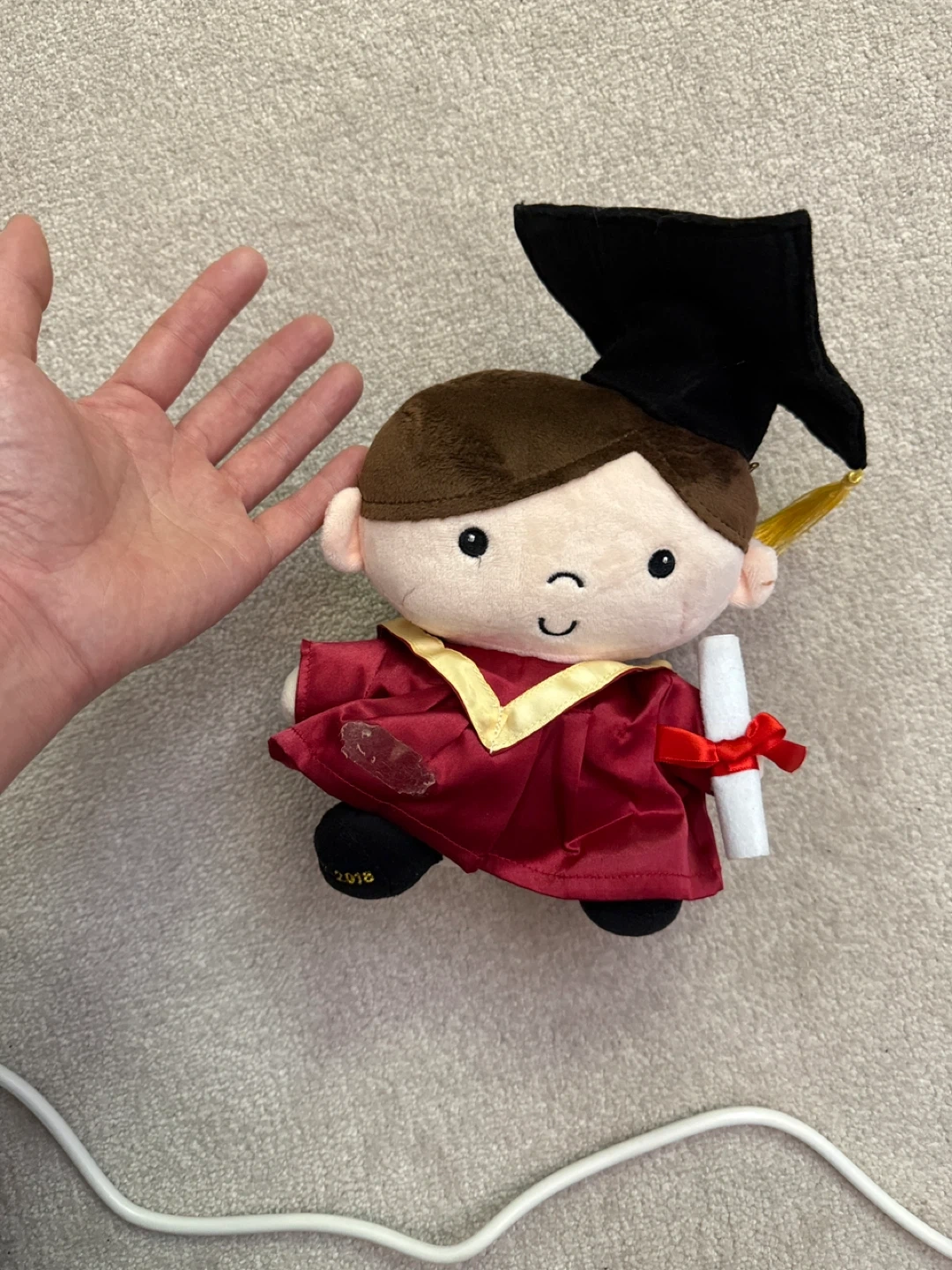 Selling a cute graduation plush toy! It's wearing a red gown and a black graduation cap. There's a small mark on the gown.