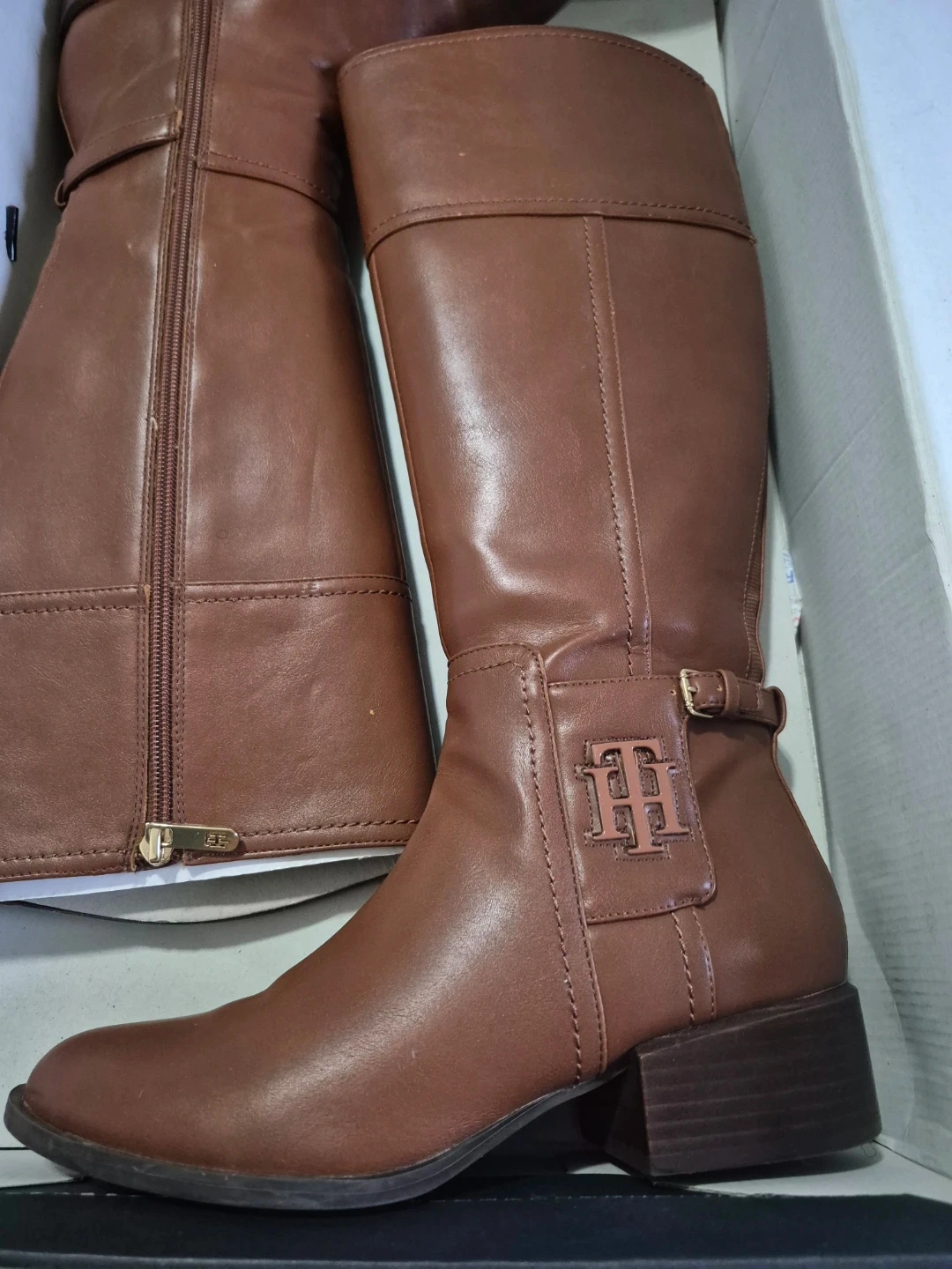 Here are some stylish 2011 Tommy Hilfiger brown leather boots! They have a nice block heel and the classic Tommy Hilfiger logo on the side. Great for adding a touch of class to any outfit NIB
