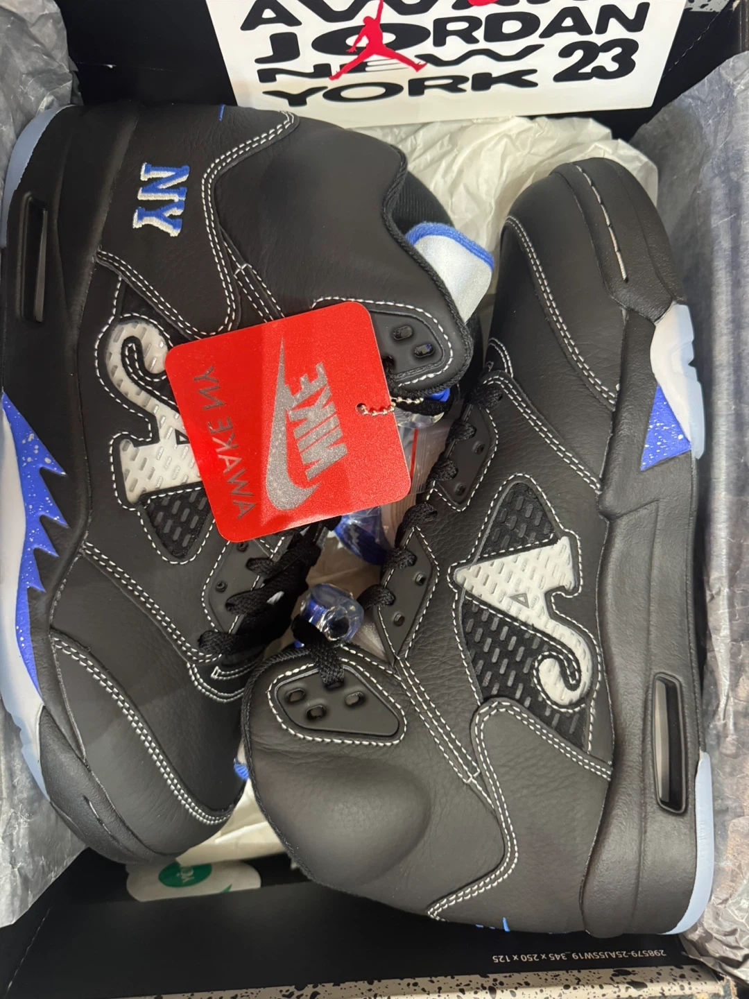 Selling a pair of Nike Air Jordan 5 Retro new York Awake .These are in great condition and come with the original box. The shoes feature a black leather upper with white stitching and blue accents. Perfect condition.