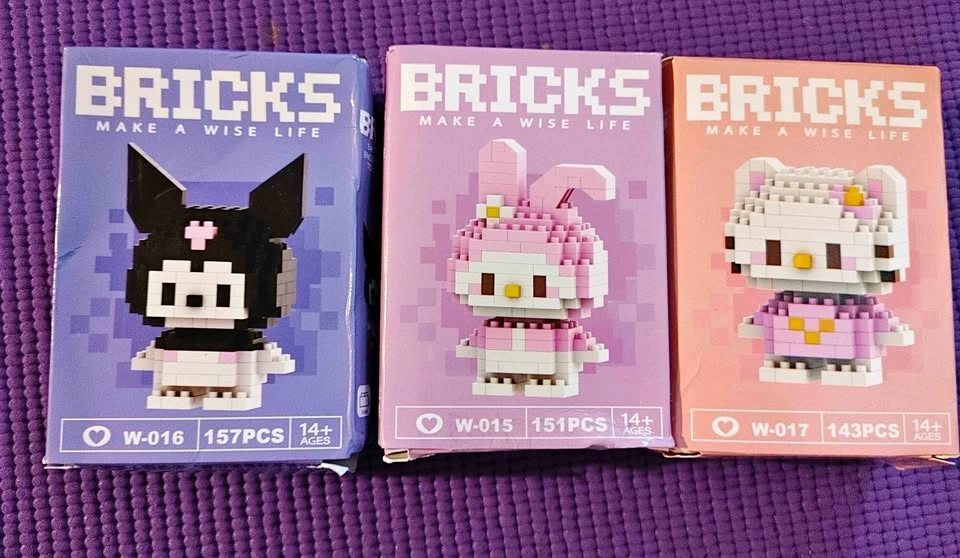 33Three Bricks Make a Wise Life sets featuring Sanrio characters for sale! - Kuromi (157 pieces) - My Melody (151 pieces) - Hello Kitty (143 pieces) Includes the pieces and instructions inside. Unfortunately, the box came crushed during shipping but the items inside are intact and the bags have never been opened. Makes for fun friends and family night and can be displayed after 🥰 Thank you for your interest!