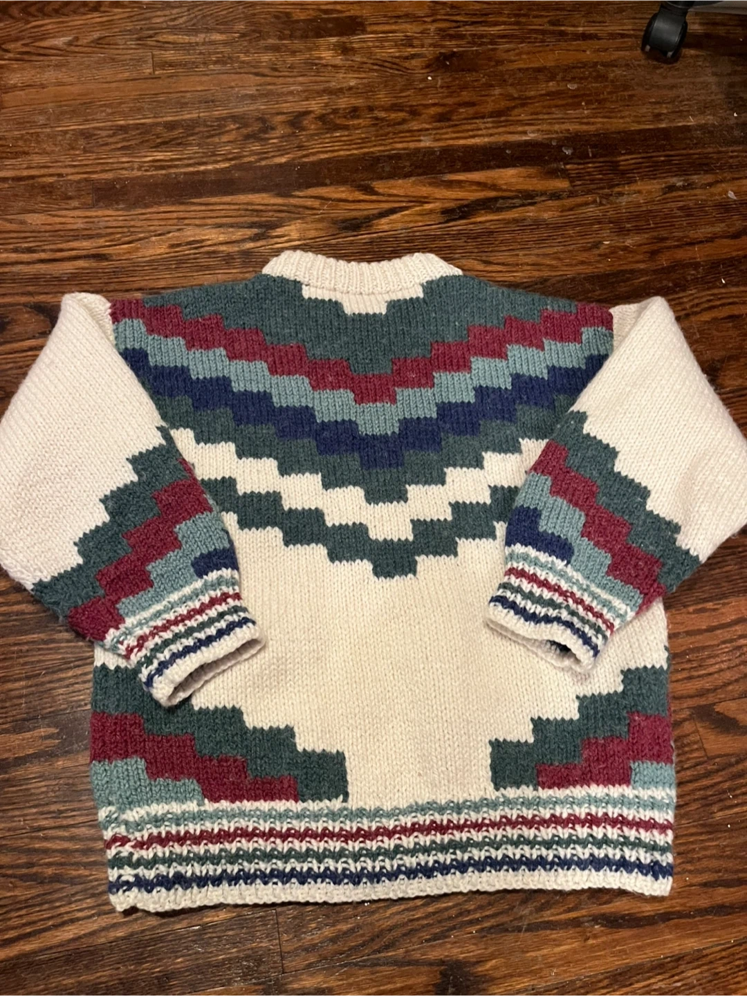 Cozy vintage knit sweater with a unique geometric pattern! The colours are a mix of cream, green, navy, and burgundy. Perfect for staying warm and stylish this fall or winter