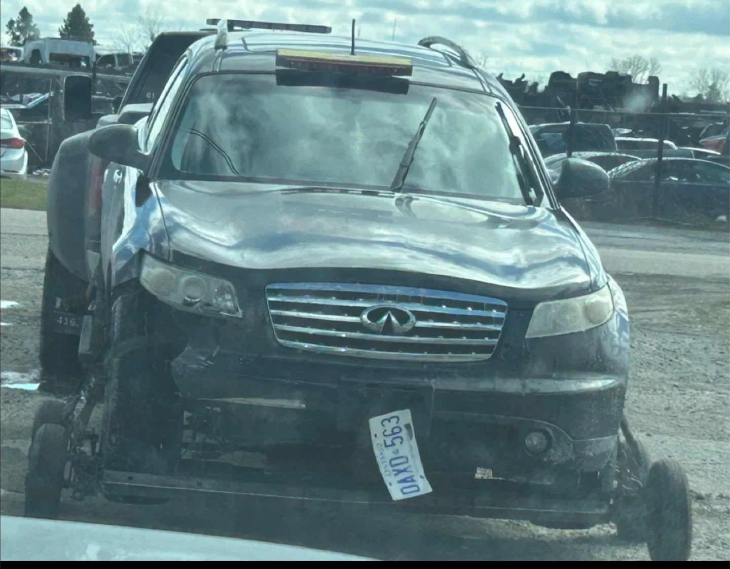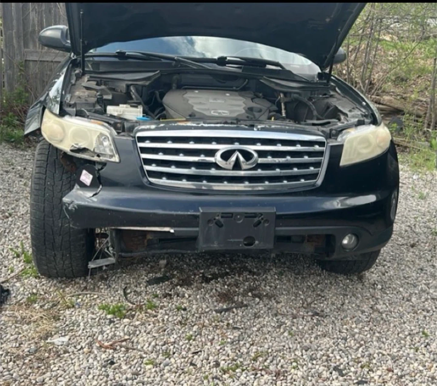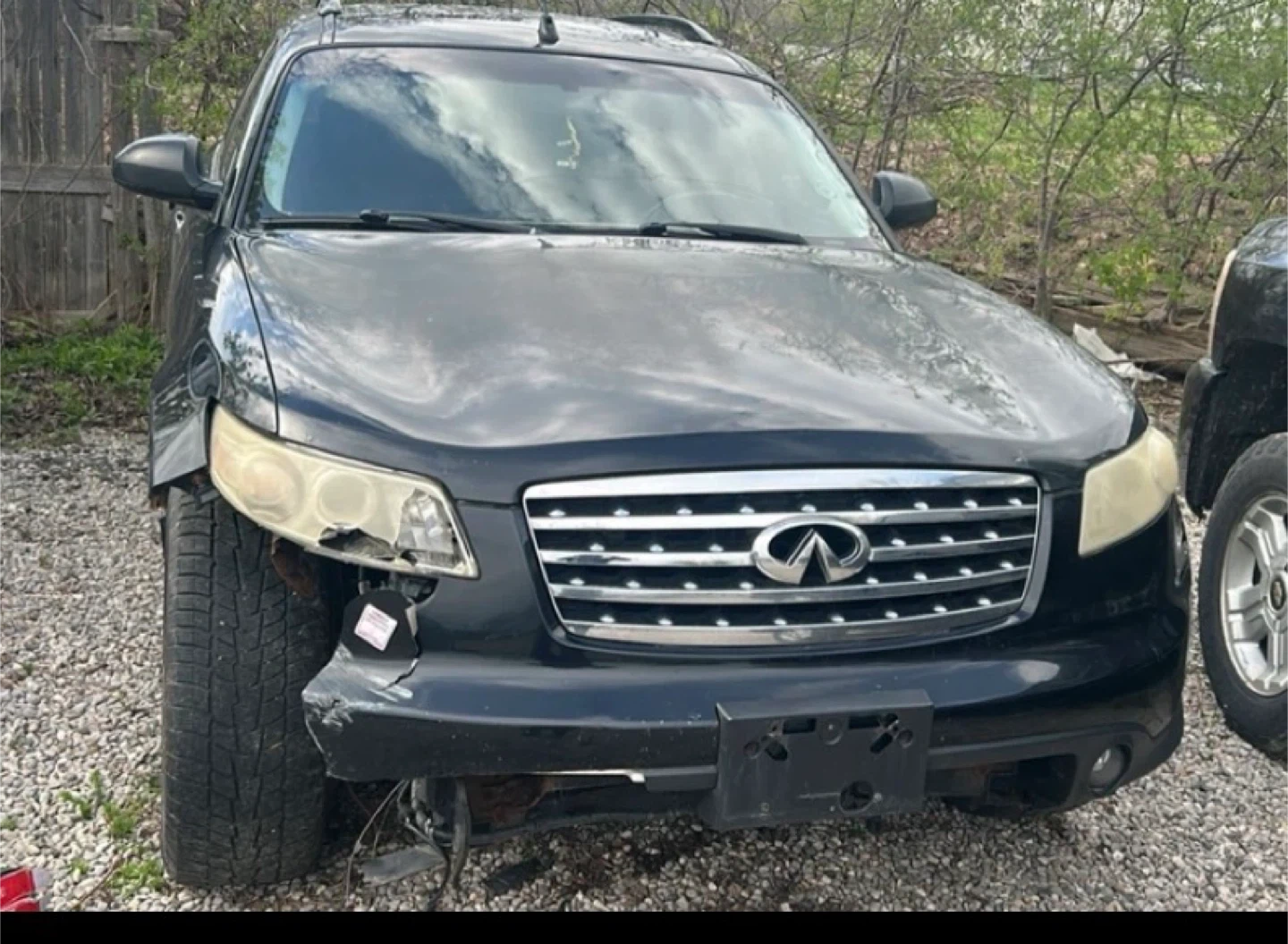 Selling a black Infiniti FX35 SUV. It has some visible damage to the front bumper and headlight. The odometer reads 213282 km. I will also sell it for parts if you need winter tires I have that as well.