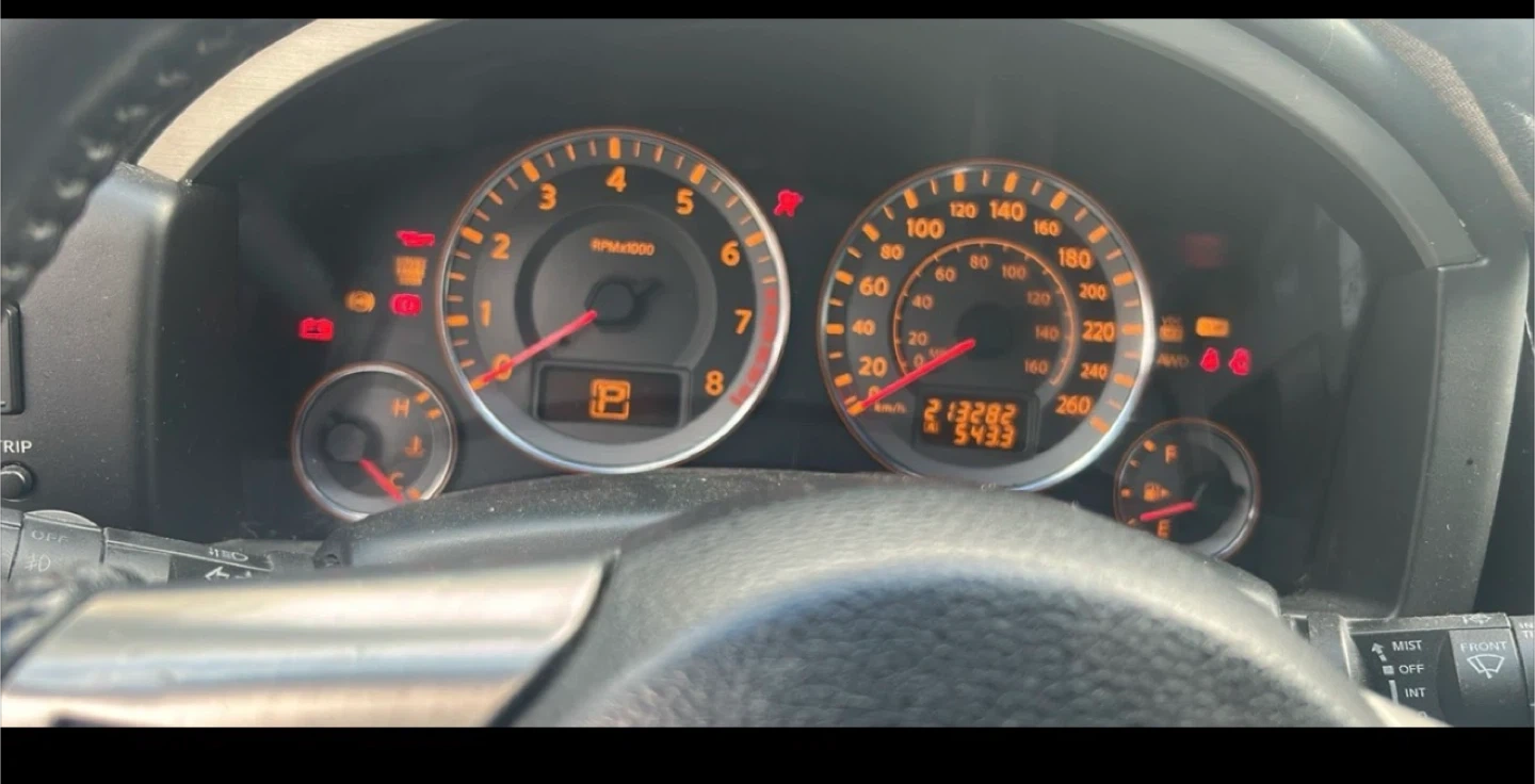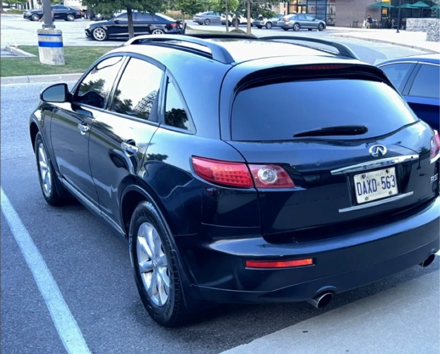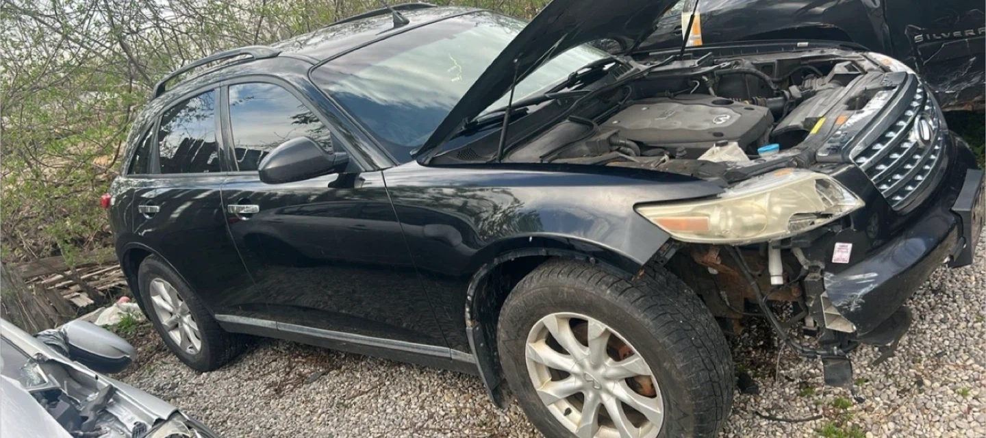 Selling a black Infiniti FX35 SUV. It has some visible damage to the front bumper and headlight. The odometer reads 213282 km. I will also sell it for parts if you need winter tires I have that as well.