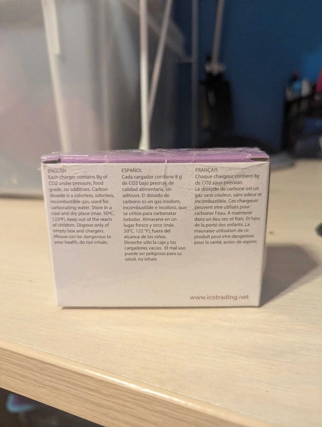 I'm selling a new box of ICO CO2 Chargers, each containing 8g of CO2, perfect for carbonating water and other beverages. This is a food-grade product, ensuring safety and quality for your culinary creations. It's the perfect accessory for making sparkling drinks right at home! Specifications: