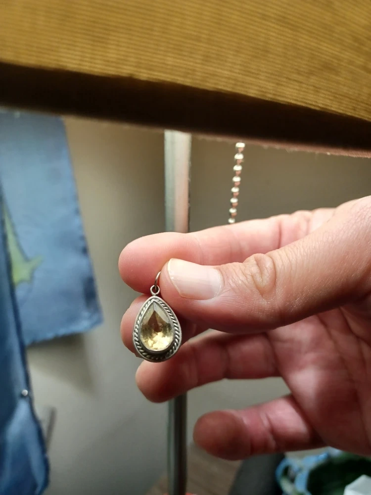 This is a teardrop pendant. It has a silver-925 metal trim around the citrine stone. It would look great on a necklace or bracelet!