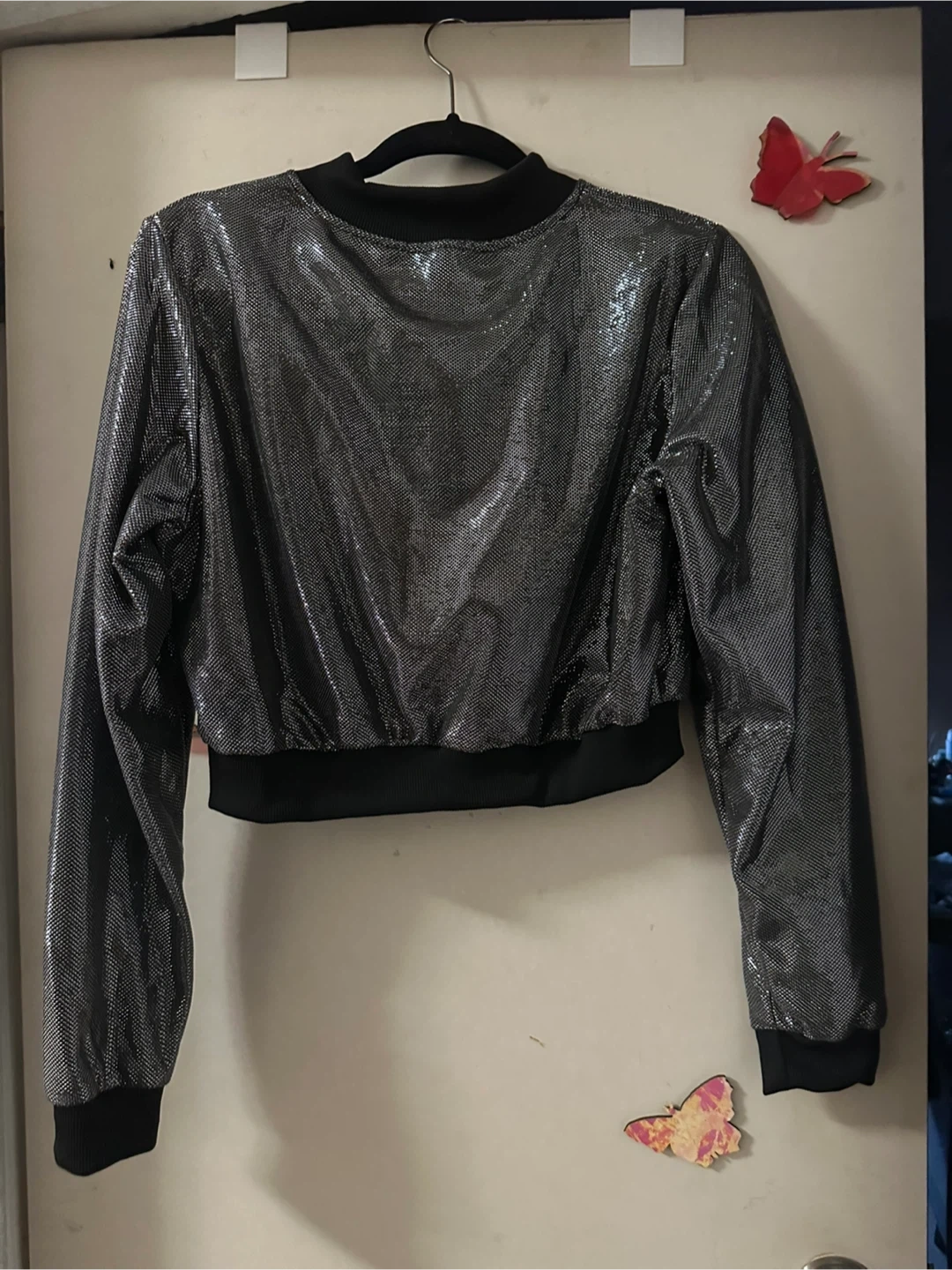 Selling a stylish silver bomber jacket! It features a unique shimmering texture and a classic bomber silhouette. Perfect for adding a bit of sparkle to your wardrobe. Great condition, never worn.