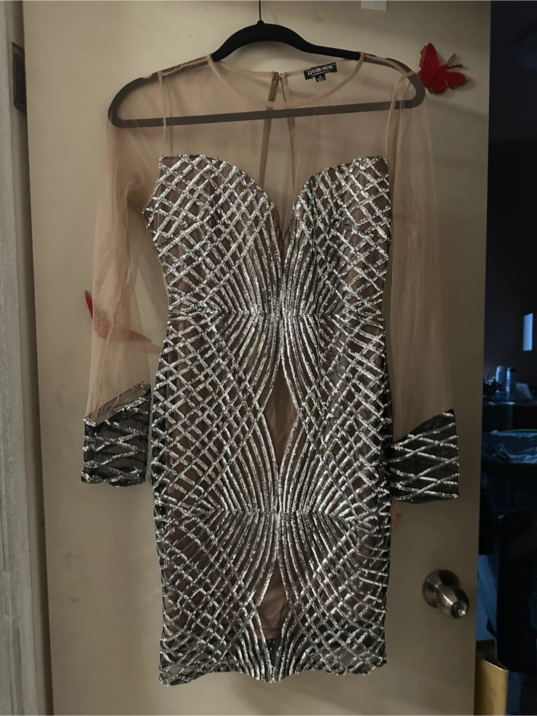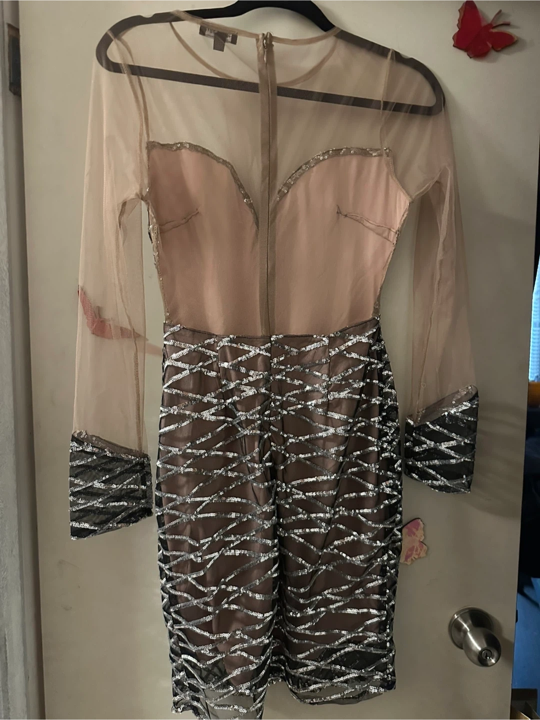 Selling a Fashion Nova mini dress with sequin detailing. The dress has a nude underlay with a sheer top and long sleeves. Perfect for a night out!