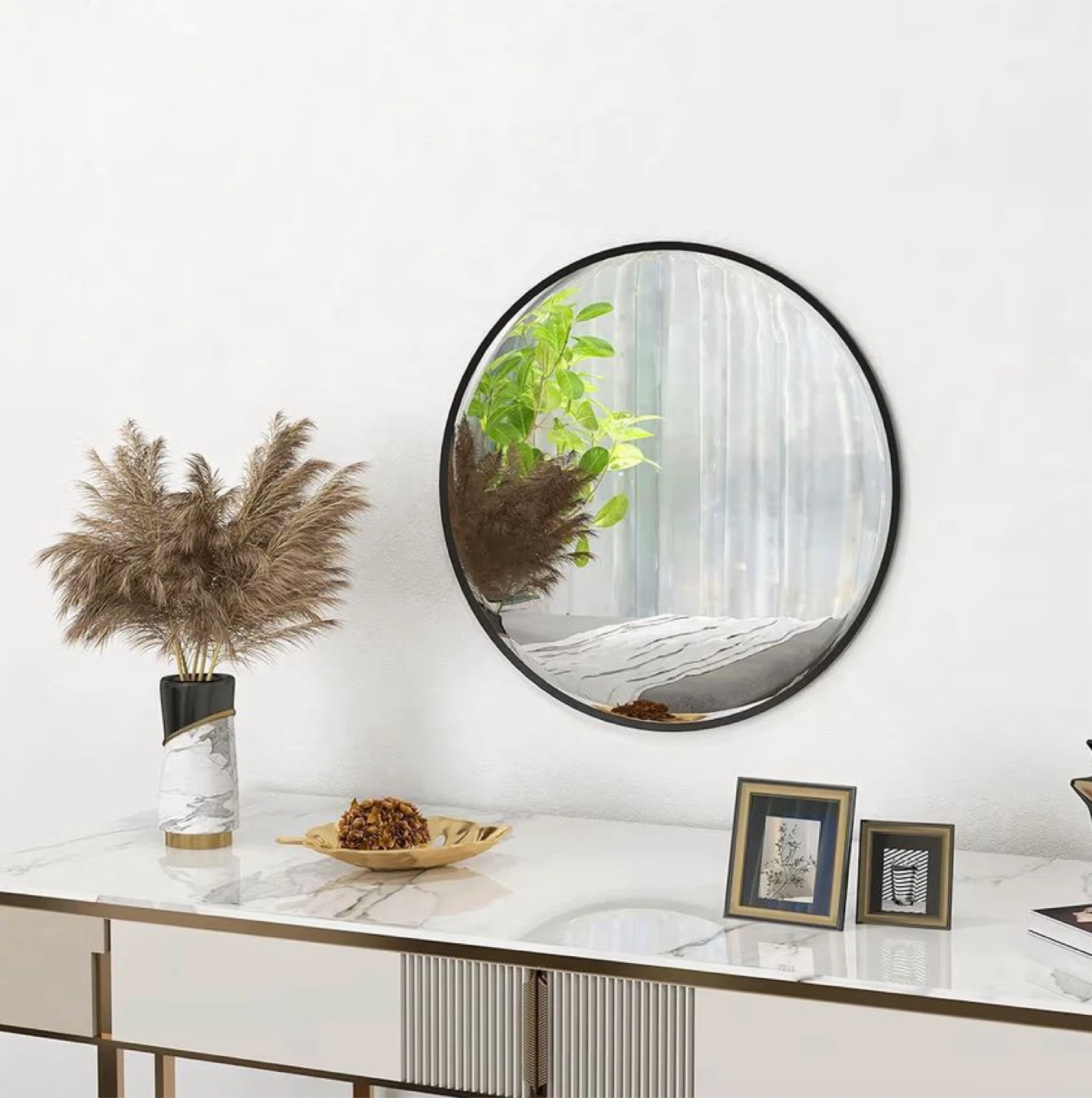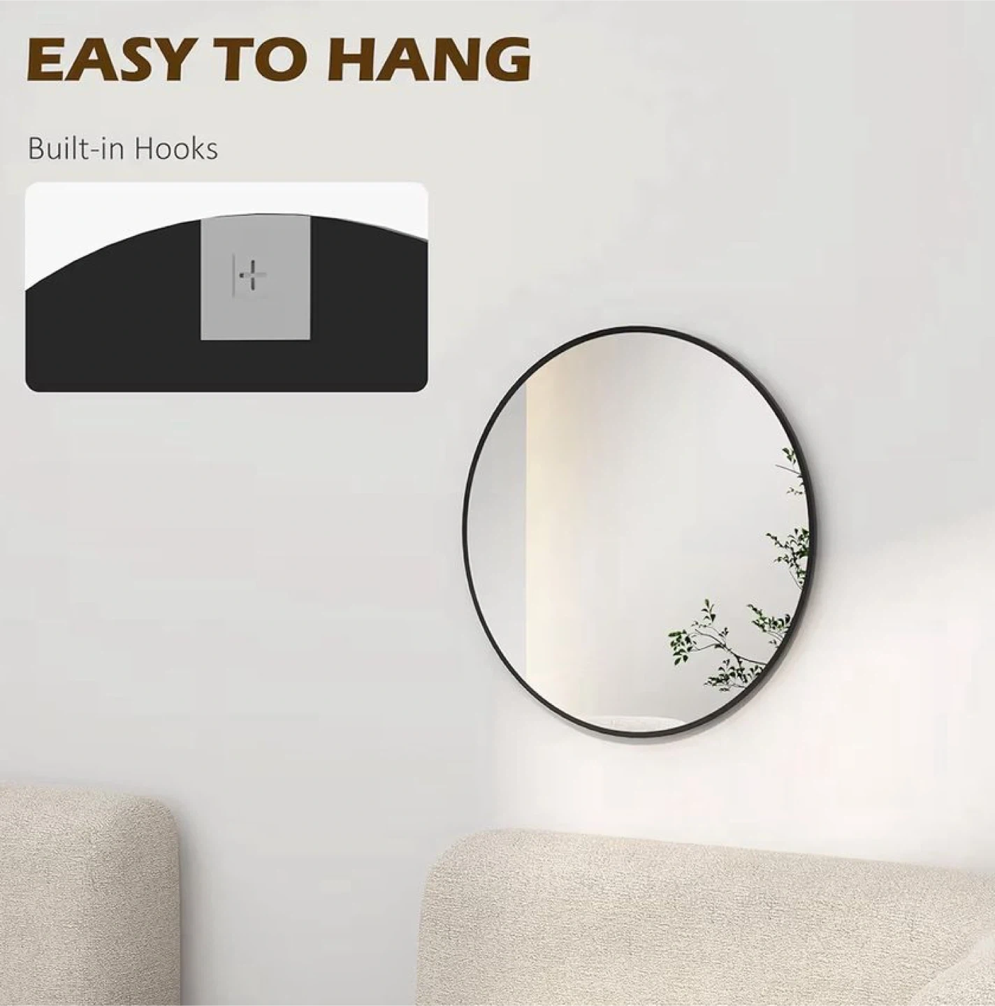 This round wall mirror is in great condition and ready to brighten up your space! It measures 24 inches in diameter and features a sleek, modern design with a black frame. It's easy to hang with built-in hooks, making it a convenient addition to any room
