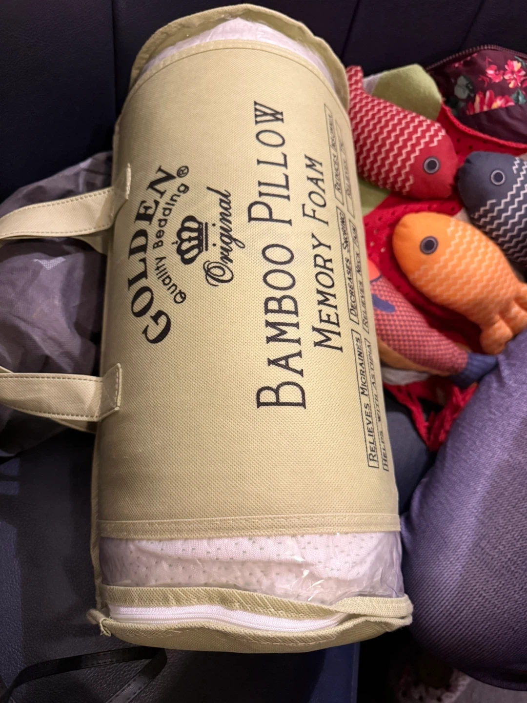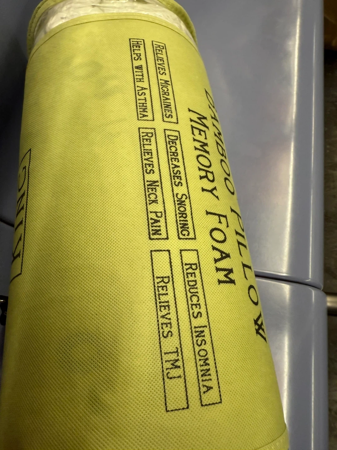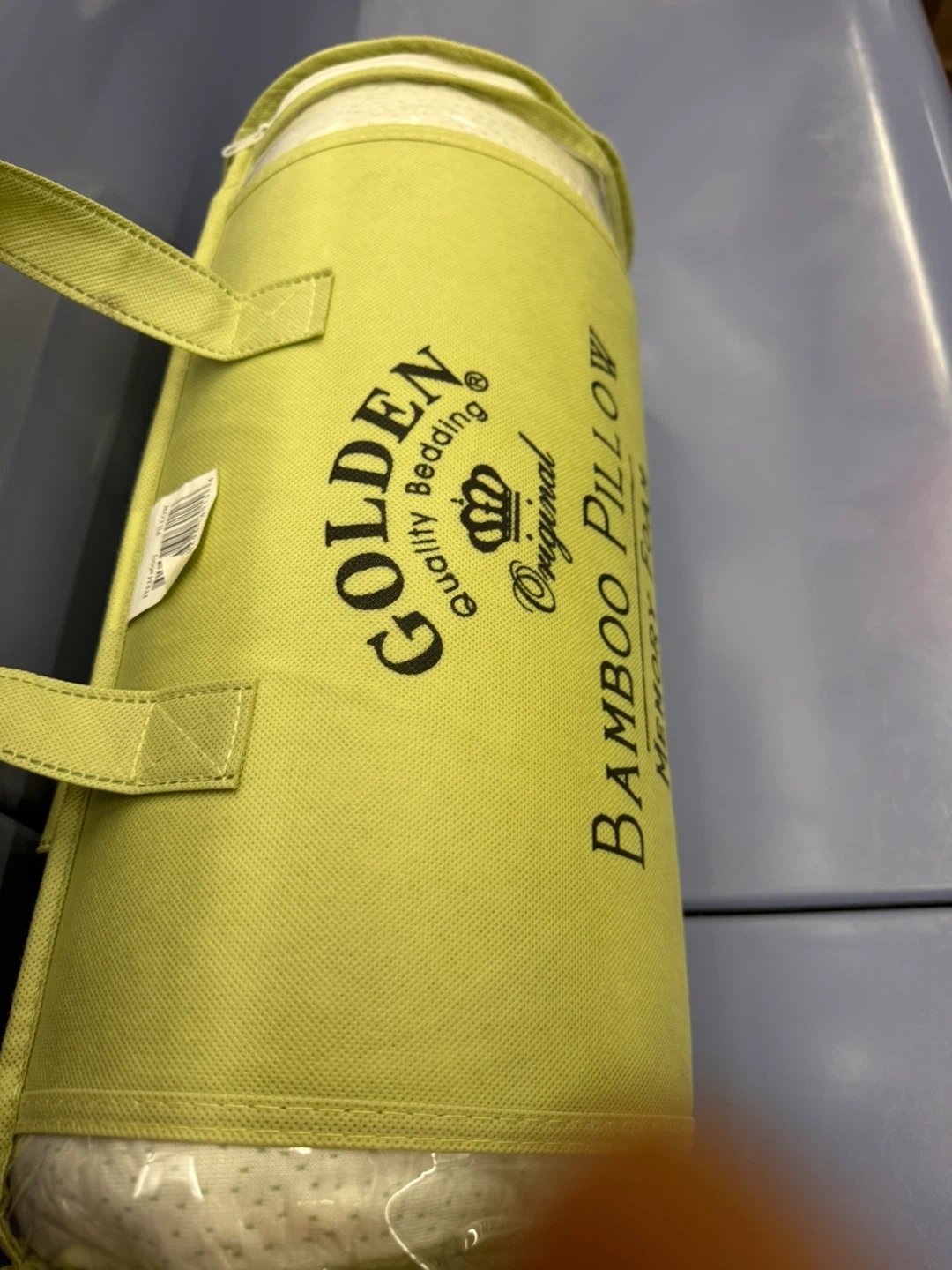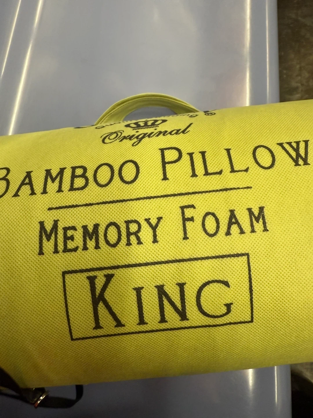 NWB Golden Quality Bedding Bamboo Pillow in King size! It's designed with memory foam and comes in its original packaging. The pillow helps with migraines, decreases snoring, and reduces insomnia. It also relieves neck pain and TMJ