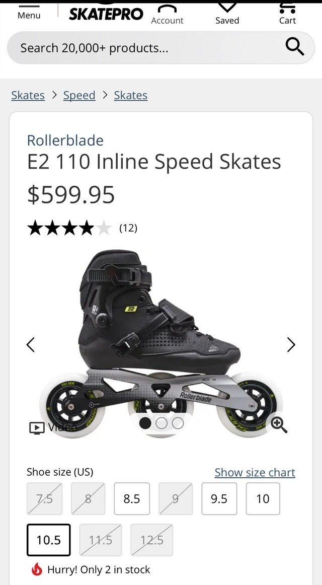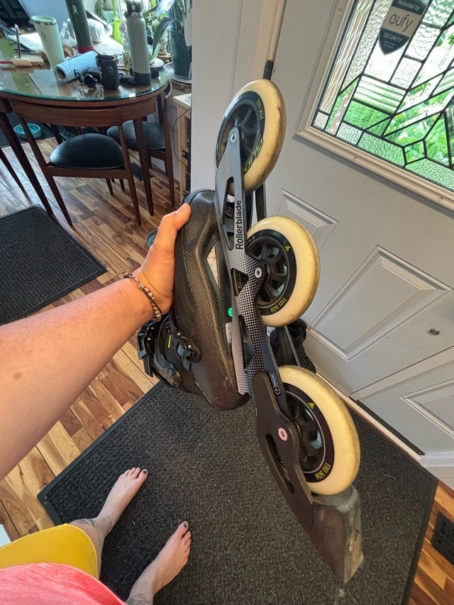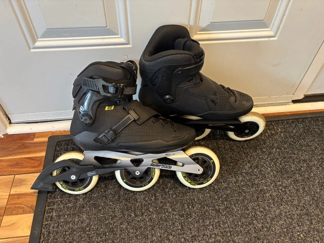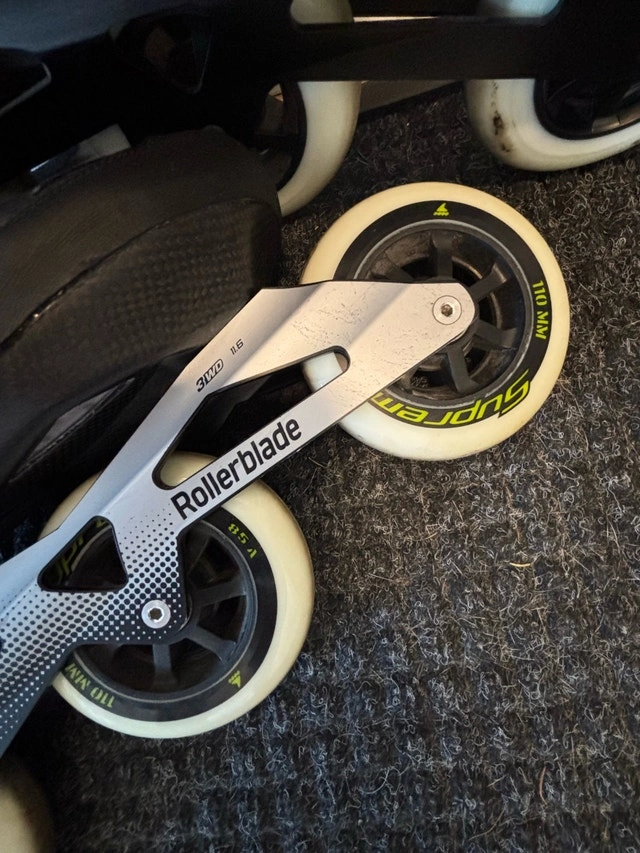 Rollerblade E2 110 Pro Inline Speed skate. Take your skating to the next level. These are not your beginner skate; these are geared towards long distance and speed skating, or thrill seekers. Used 2-3 times, I have a different pair I just prefer more than these for personal preference. They work great, minimal wear on wheels. Size: EU 42 US 9 (men’s) women’s 11 (I wear a 10 normally) CM 27.0 These skates new at SkatePro.ca are $600. “The Rollerblade E2 110 speed skates offer an impressive balance between price and performance. Gear up to unleash the turbo mode, powered by these large wheels. These Rollerblade speed skates feature a high-quality semi-soft boot construction. Enjoy the benefits of both stability and comfort thanks to their semi-soft design. Note that the Rollerblade E2 110 tend to run small. Therefore, we suggest selecting one size larger than your normal shoe size. These skates are ideal if you have slightly wider feet. A high-cut cuff provides excellent ankle support, helping to stabilize and reduce muscle fatigue The REMOVABLE cuff lets you switch from a fitness-focused setup to a speed-oriented race configuration - Aluminium frame delivers direct handling characteristics and is extremely lightweight - 3-wheel configuration for effortless acceleration - 110mm wheels with a hardness of 85A and a narrow profile for reduced friction and increased speed - Integrated liners crafted to fit anatomically - Ensure you inspect the screws before using the skates for the first time and tighten them if needed. Additionally, regularly check the screws to ensure they remain in good condition. The skates can be upgraded to accommodate 125mm wheels. However, be advised that the brake is incompatible with 125mm wheels.