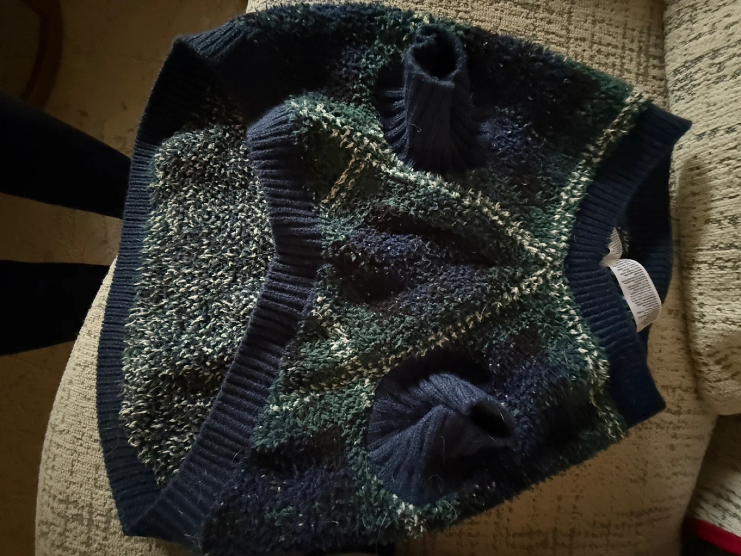 353Here's a cozy Old Navy sweater vest in a fun plaid pattern! It's a size L and made of a soft, comfortable material. Perfect for Medium or Large size of dog!