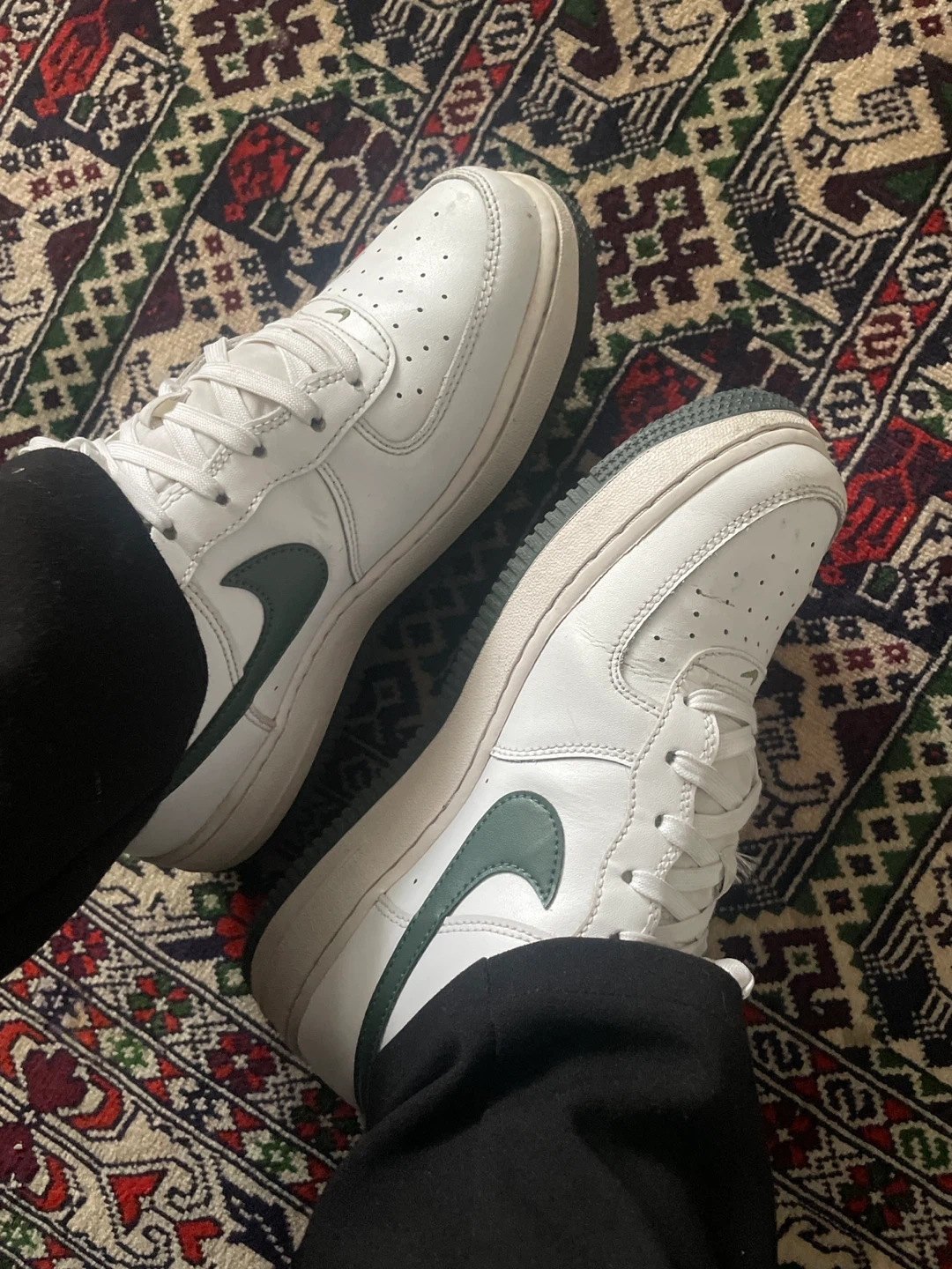 Selling a pair of Nike Air Force 1 '07 sneakers in a classic white and pine green colourway! These shoes are a timeless style that's super versatile. They show some signs of wear, but still have lots of life left in them. Perfect for everyday wear!