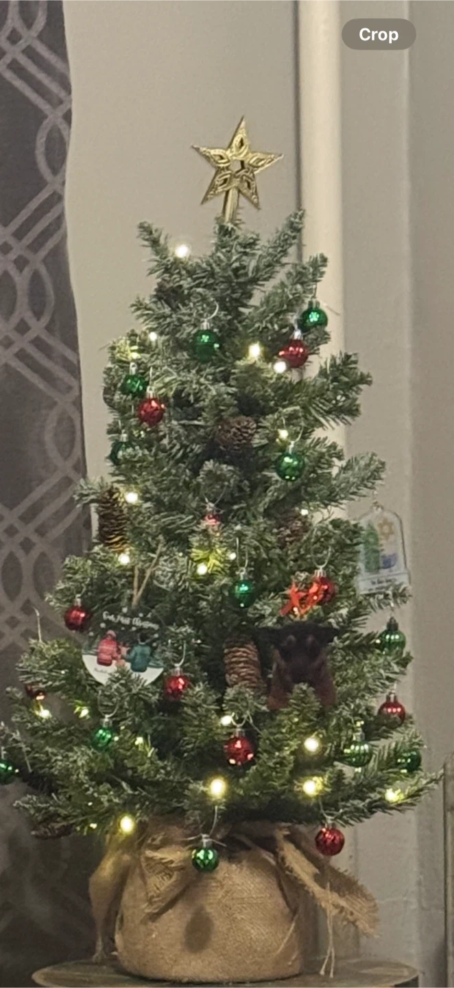 Selling a National Tree Company 3ft Pre-Lit Mini Flocked Artificial Christmas Tree. It includes pinecones, 50 clear LED lights, a timer, 130 tips, and a burlap base. It also comes with the original box!