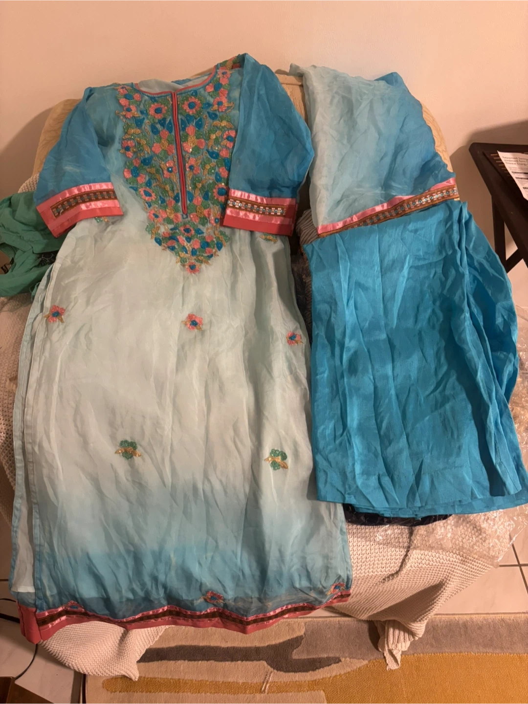 56Here's a beautiful blue salwar kameez and Duppata with lovely embroidery. It looks to be in great condition and comes with the matching dupatta. Perfect for a special occasion or just to add some colour to your wardrobe! Chest size 18