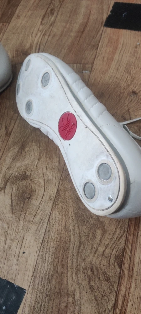 Selling a pair of Adidas white leather sneakers. They are in good condition with some signs of wear on the soles. Great for everyday wear!