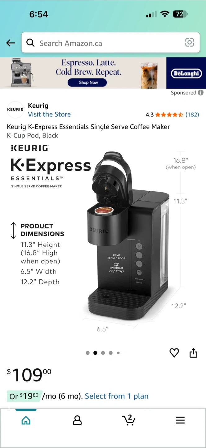 Selling a Keurig K-Express Essentials Single Serve Coffee Maker in black. It's in great condition and comes with the box! It makes single-serve coffee using K-Cup pods. Dimensions are 11.3" Height (16.8" High when open), 6.5" Width, and 12.2" Depth. Originally bought for $109