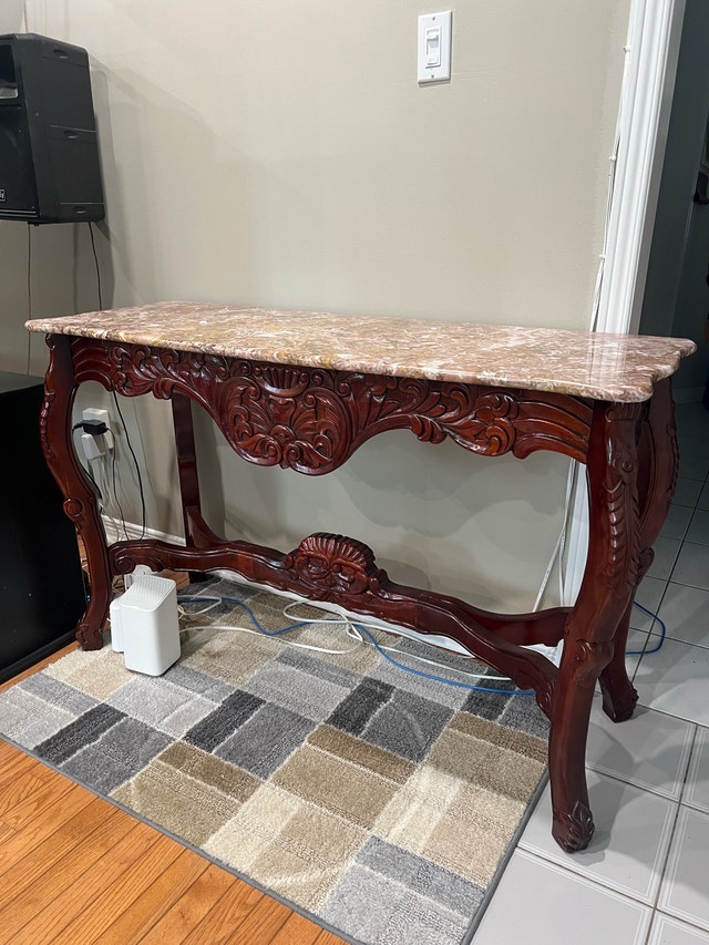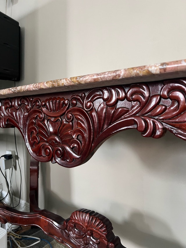 High quality console table with a rose marble top and detailed carved wood base (removable top). Floral and shell motifs. Excellent condition with no damage. Works well as an entryway table, vanity base, or accent piece.