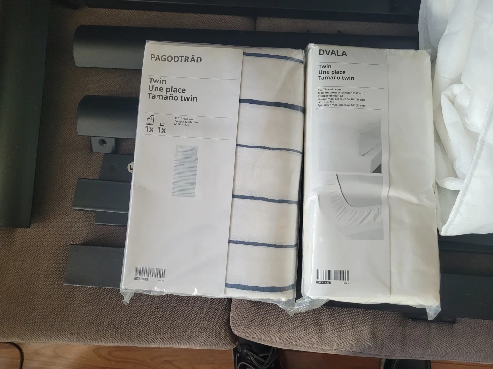Selling an IKEA twin bed frame along with a bedding set. Includes the frame components, screws, and instructions. Also comes with IKEA PAGODTRÄD and DVALA twin bedding sets twin mattress and cover. Everything is in new condition!