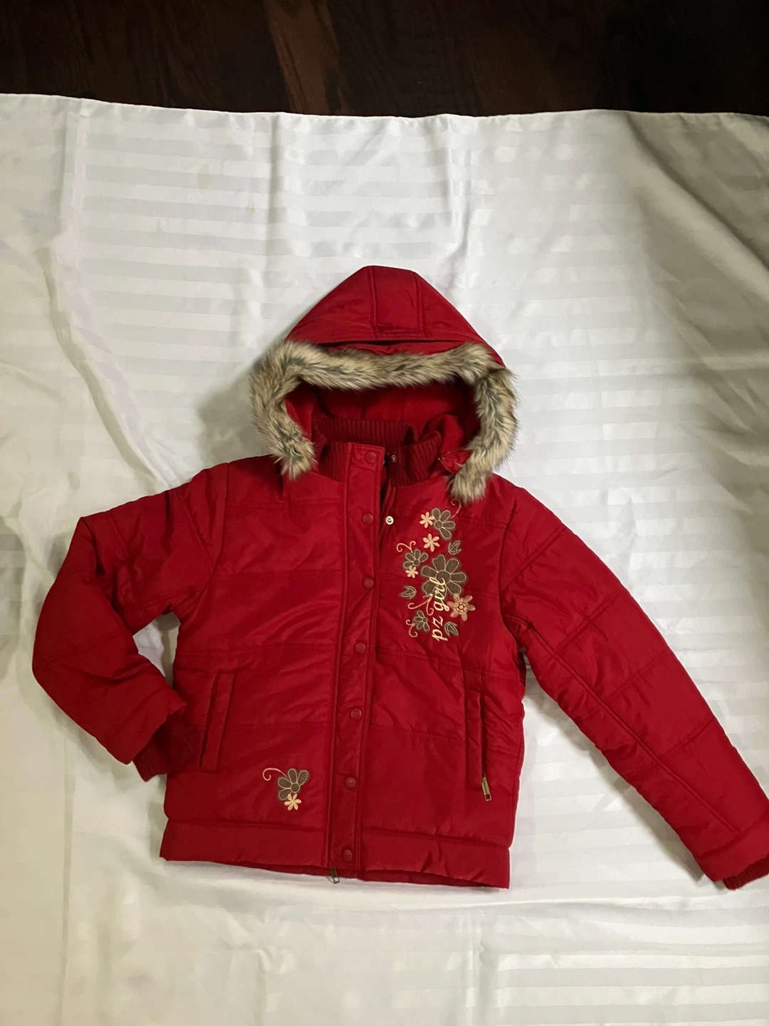 Cozy Girl quilted winter jacket with hood! It has a floral design on the front. Available in light green(XL) and red.(L) $15 EACH