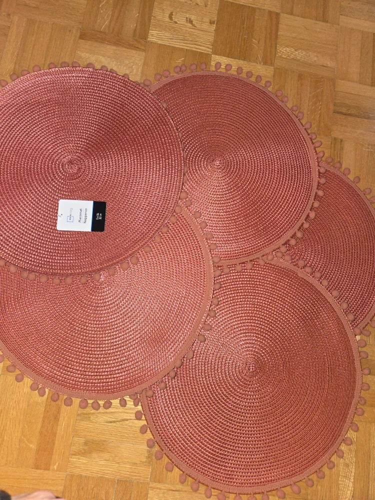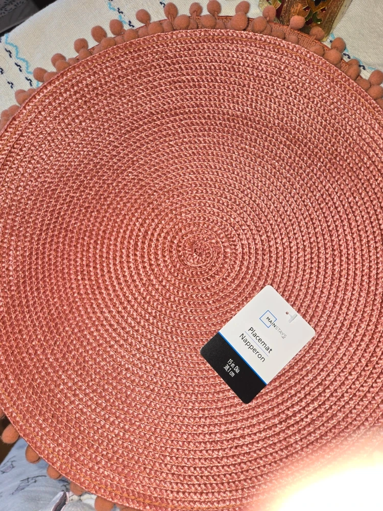 These Mainstays placemats are in new condition! They are 15 inches in diameter and have a lovely woven texture with cute pompom trim around the edge. Perfect for adding a touch of charm to your dining table!