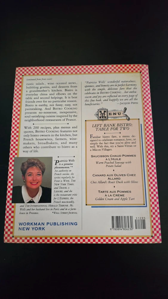 Selling a copy of "Bistro Cooking" by Patricia Wells. This cookbook features 200 recipes inspired by the small family restaurants of France. It's a great guide to creating warm, family-style meals. Published by Workman Publishing.