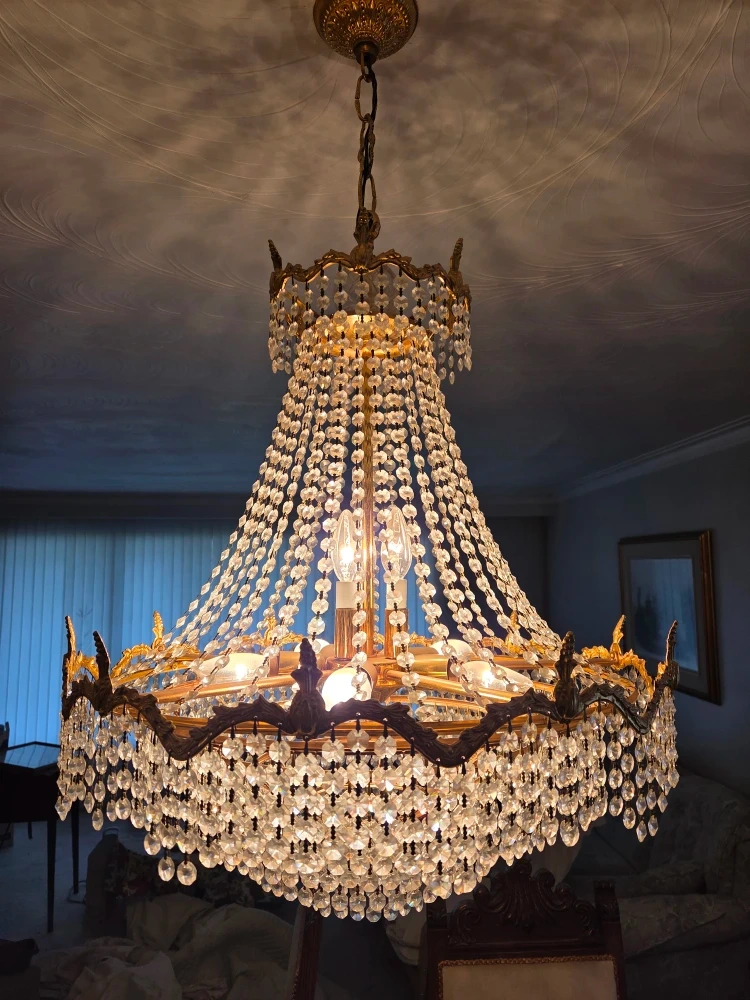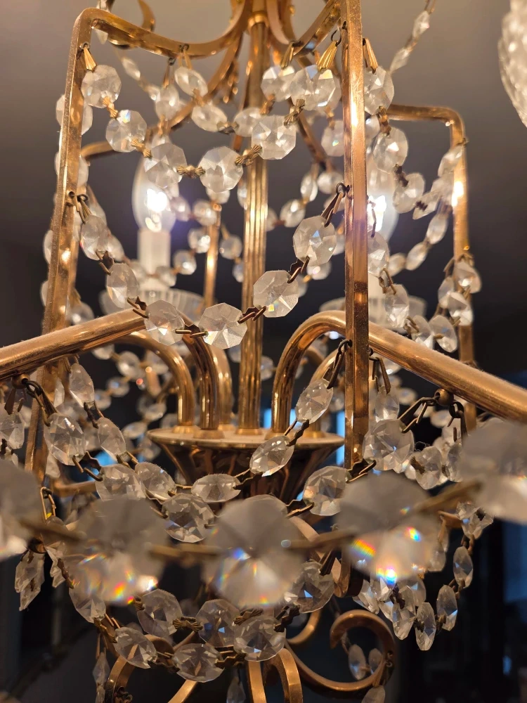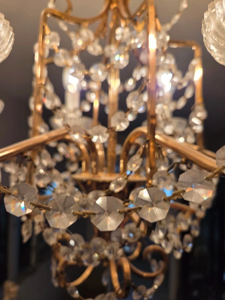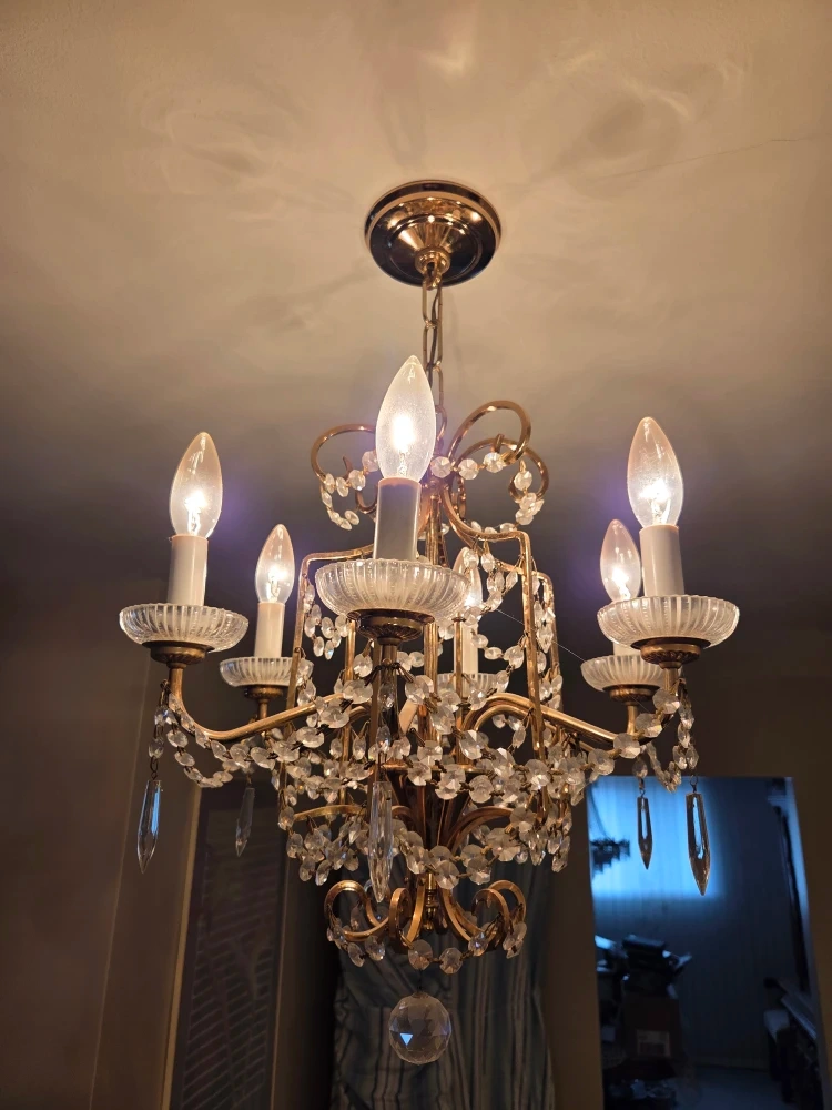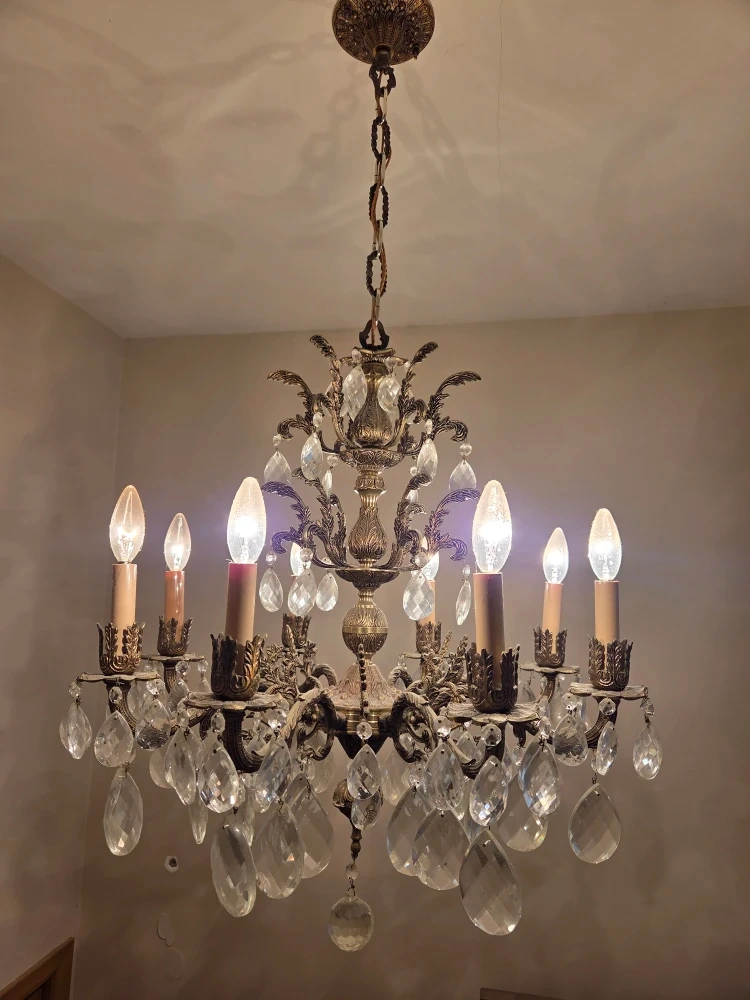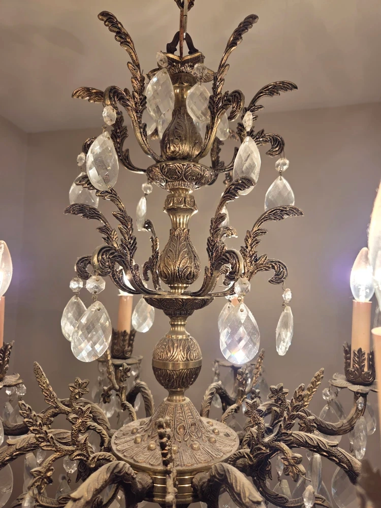 Selling a beautiful vintage chandelier with crystal accents. It has a classic and elegant design that would add a touch of charm to any room. The chandelier features multiple lights and intricate detailing. Perfect for a dining room, living room, or entryway
