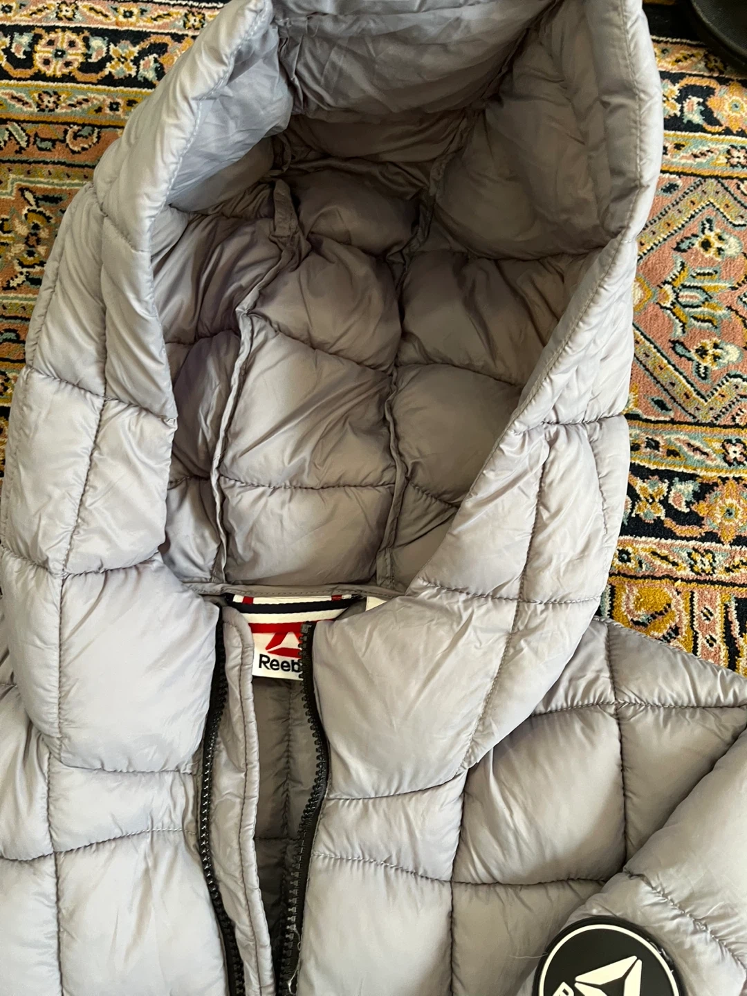 Selling a Reebok puffer jacket in size L! It's a stylish and comfortable jacket, perfect for staying warm. The jacket features a quilted design and a hood for extra protection against the elements. Great for everyday wear!