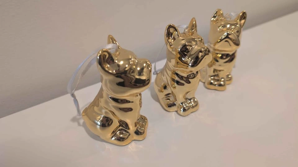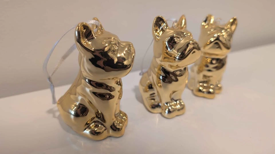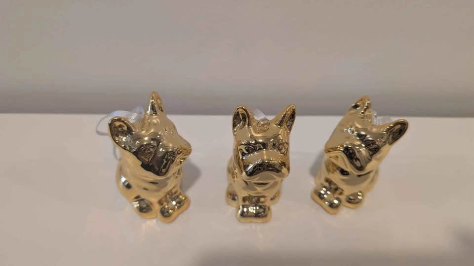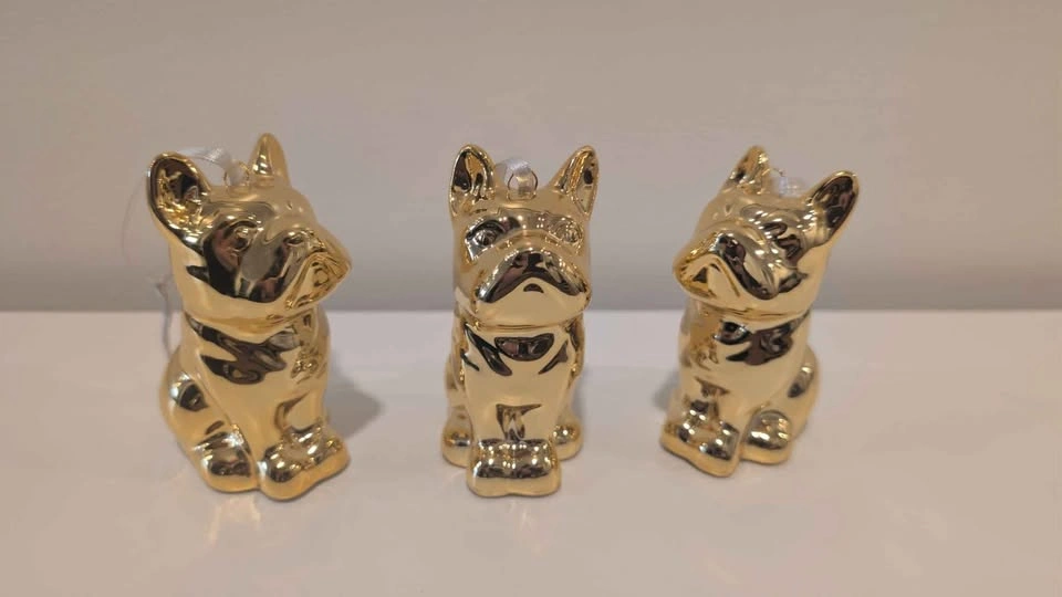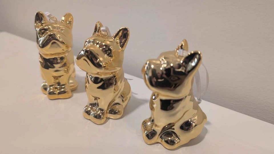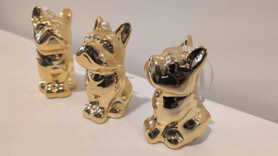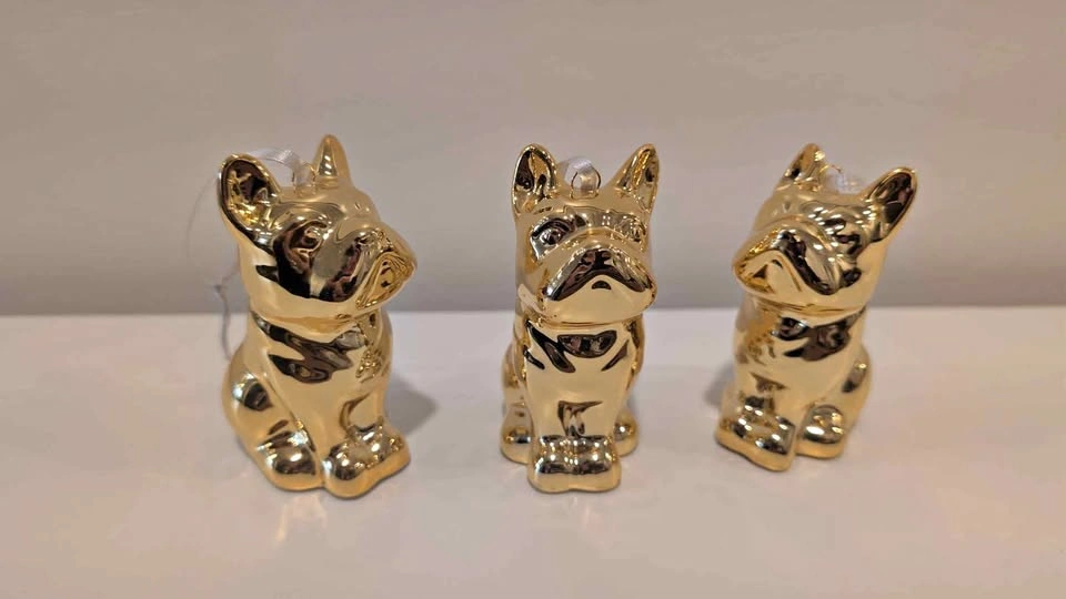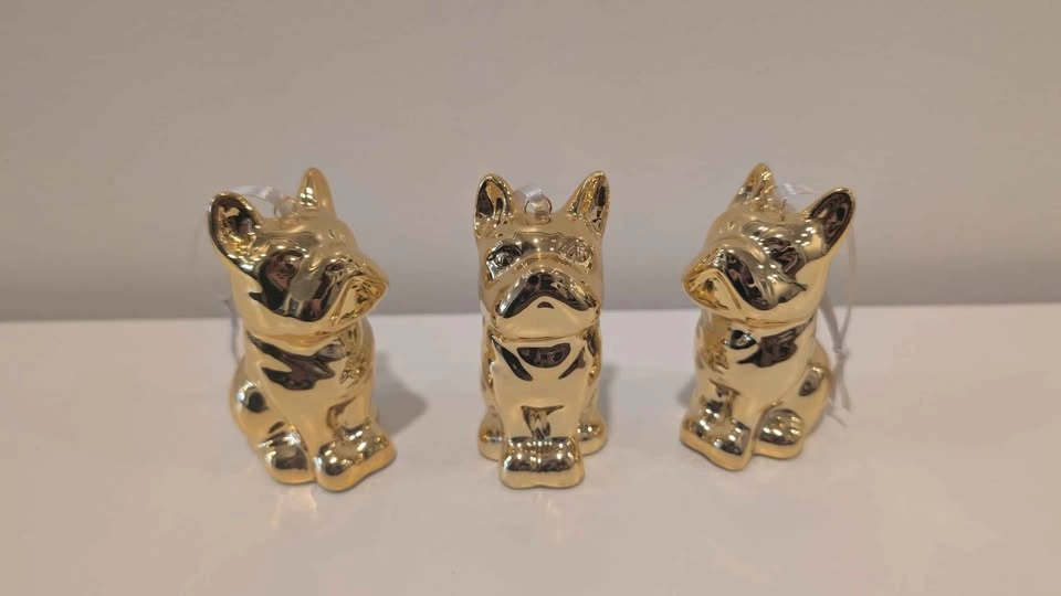 Turn your holiday tree into a gilded dog park with these absolutely charming, high-shine Frenchie ornaments. Cast in ceramic and finished with a striking brass-gold metallic glaze, this adorable trio of Frenchies brings playful luxury to your festive décor.
