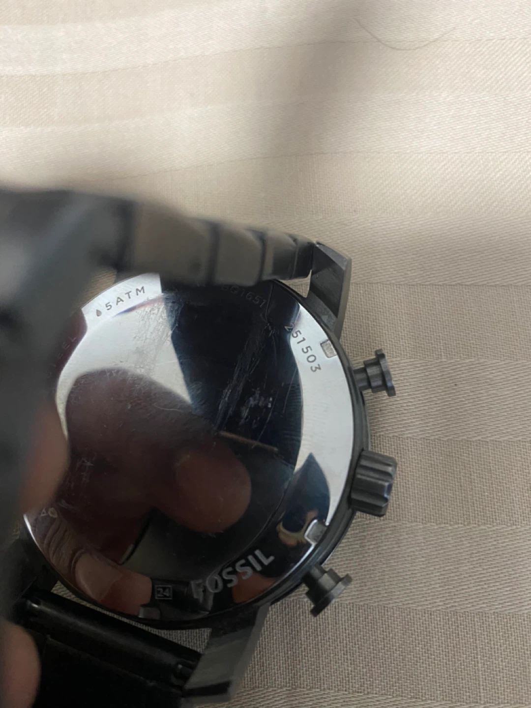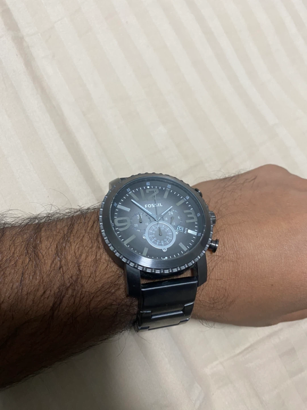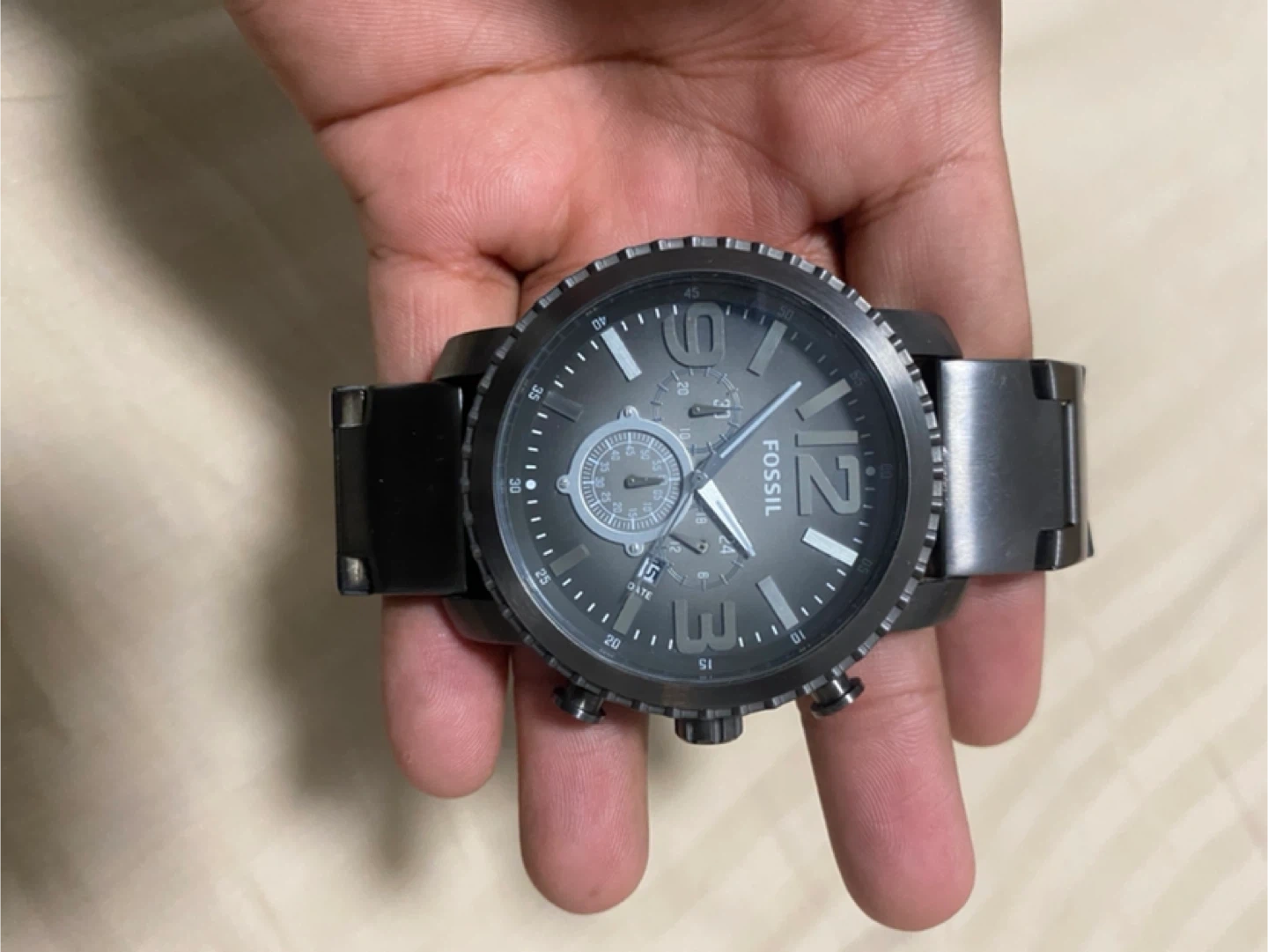 Selling a Fossil men's watch in charcoal grey metal. It's in good condition working perfectly . A stylish timepiece for everyday wear!