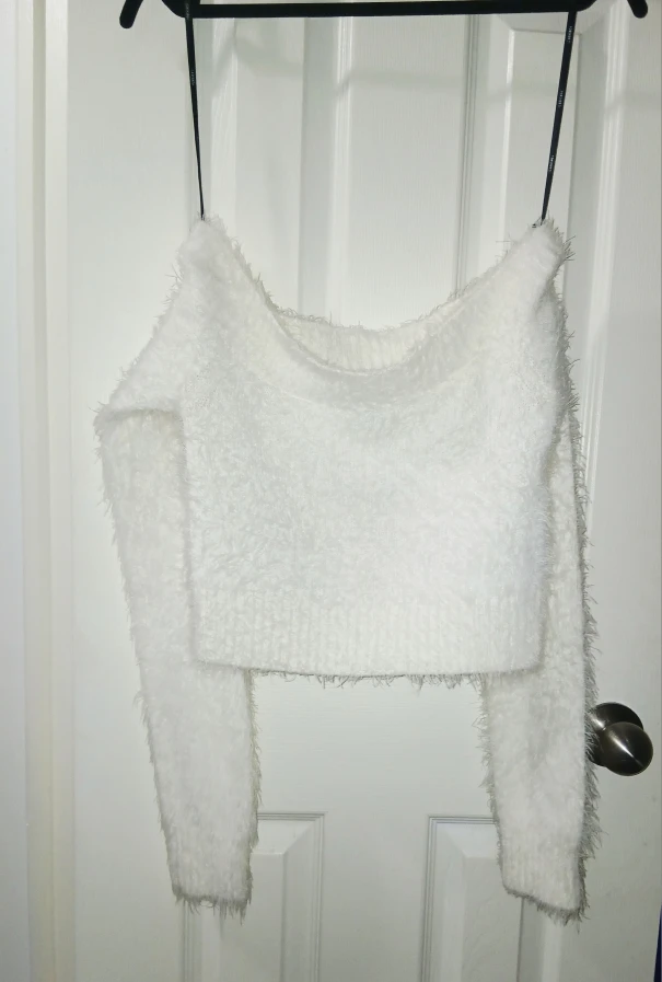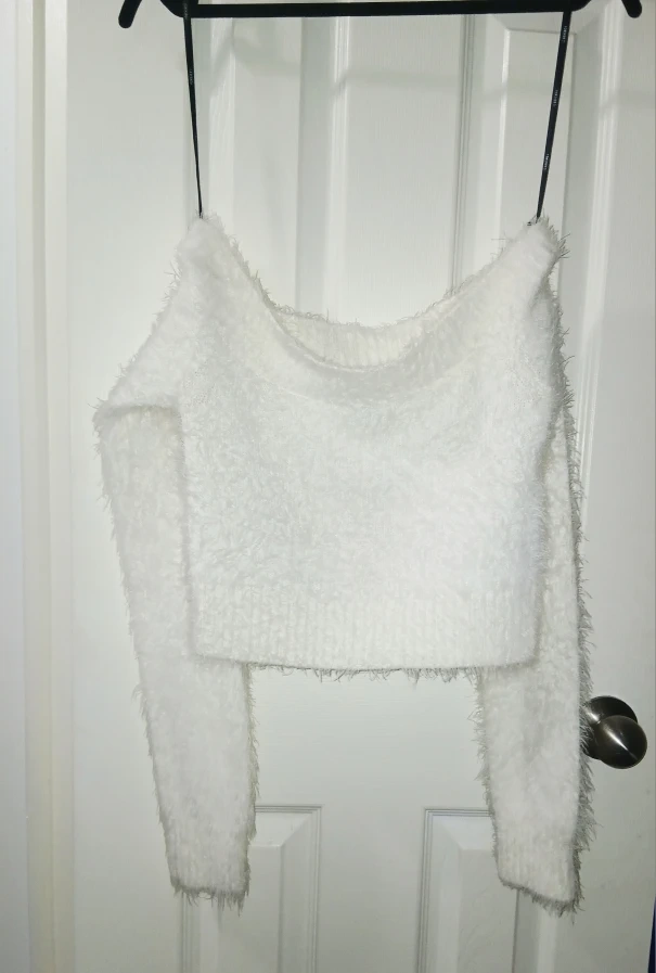 This is a cute and cozy Forever 21 off-the-shoulder sweater! It's a fuzzy, white material and is a size medium. It would be perfect for a night out or just lounging around the house!