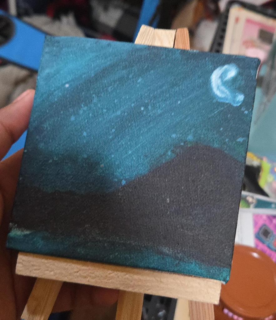 Here's a cute little canvas painting, complete with a mini easel! It features a night sky scene with a mountain and moon. Perfect for adding a touch of whimsy to any space