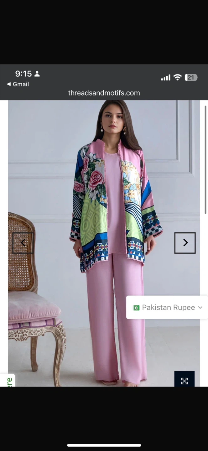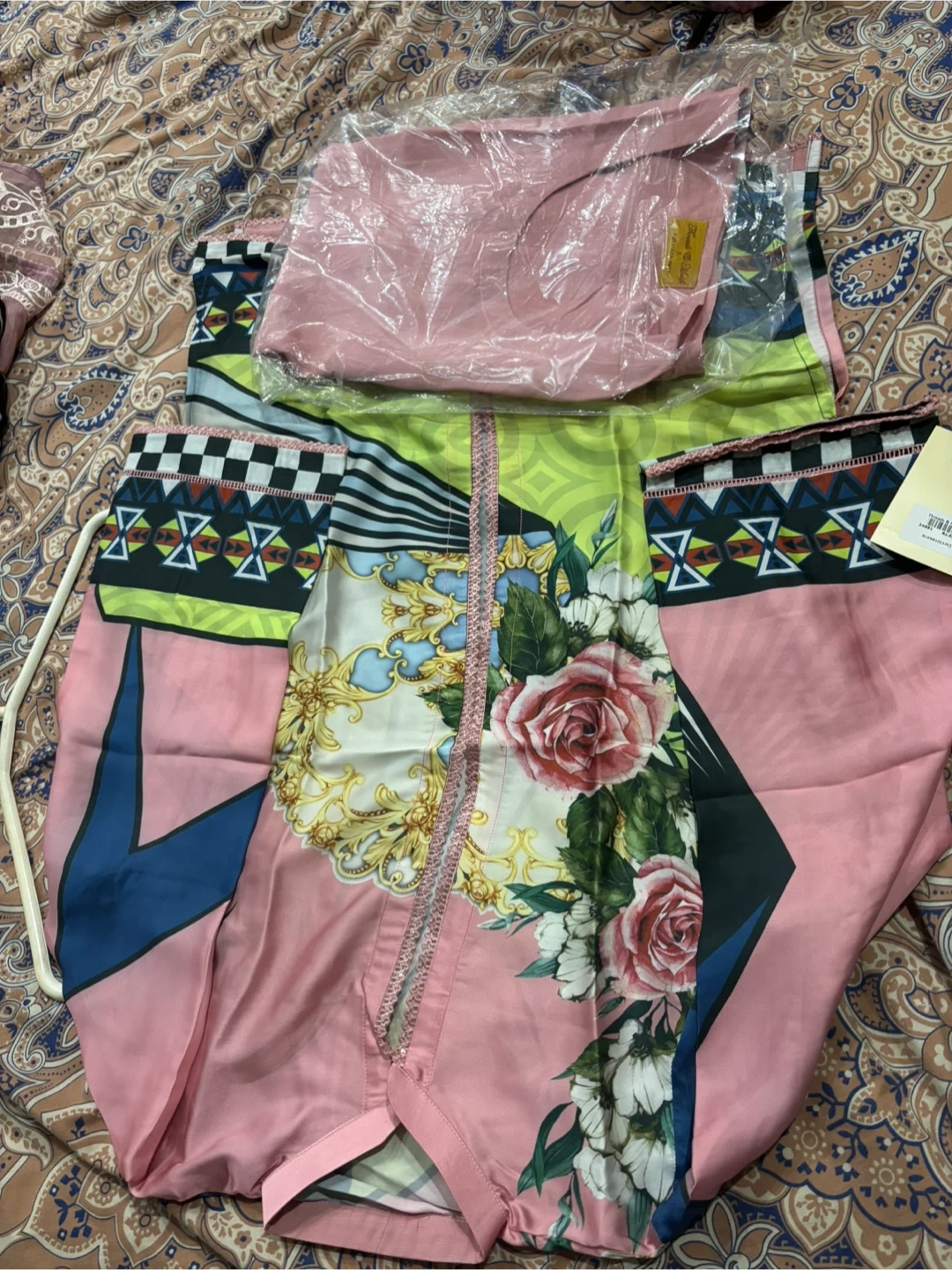 56Selling a Threads & Motifs shirt with slip in a beautiful floral silk design. It includes a top perfect for lounging in style. The colours are vibrant and the fabric feels luxurious. A great addition to your wardrobe!