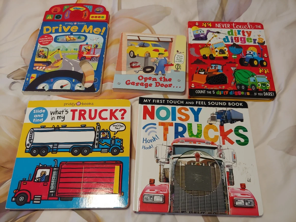 Selling a bundle of board books about trucks and other vehicles! These are great for toddlers and preschoolers who love things that go. All books are interactive either touch and feel, or sounds, or lift the flaps. All work, a couple of flaps are bent but nothing torn. Selling as a bundle for $15