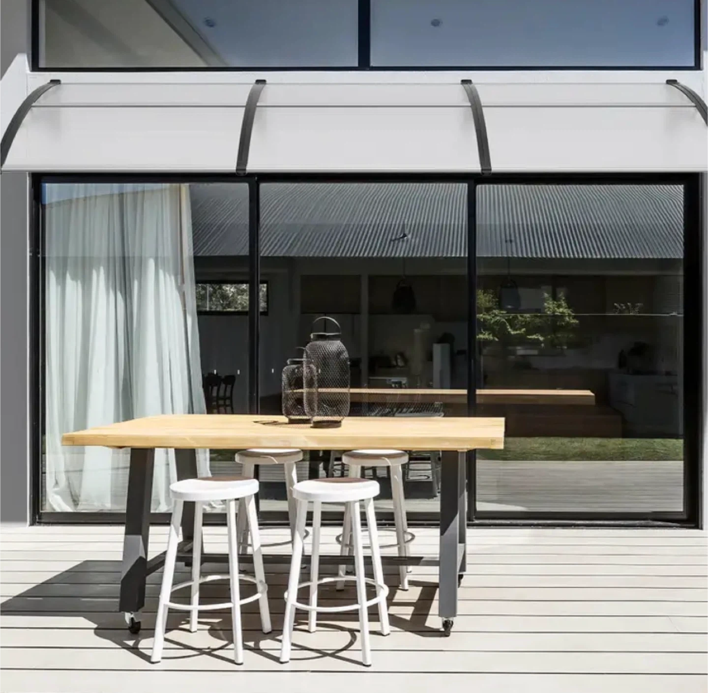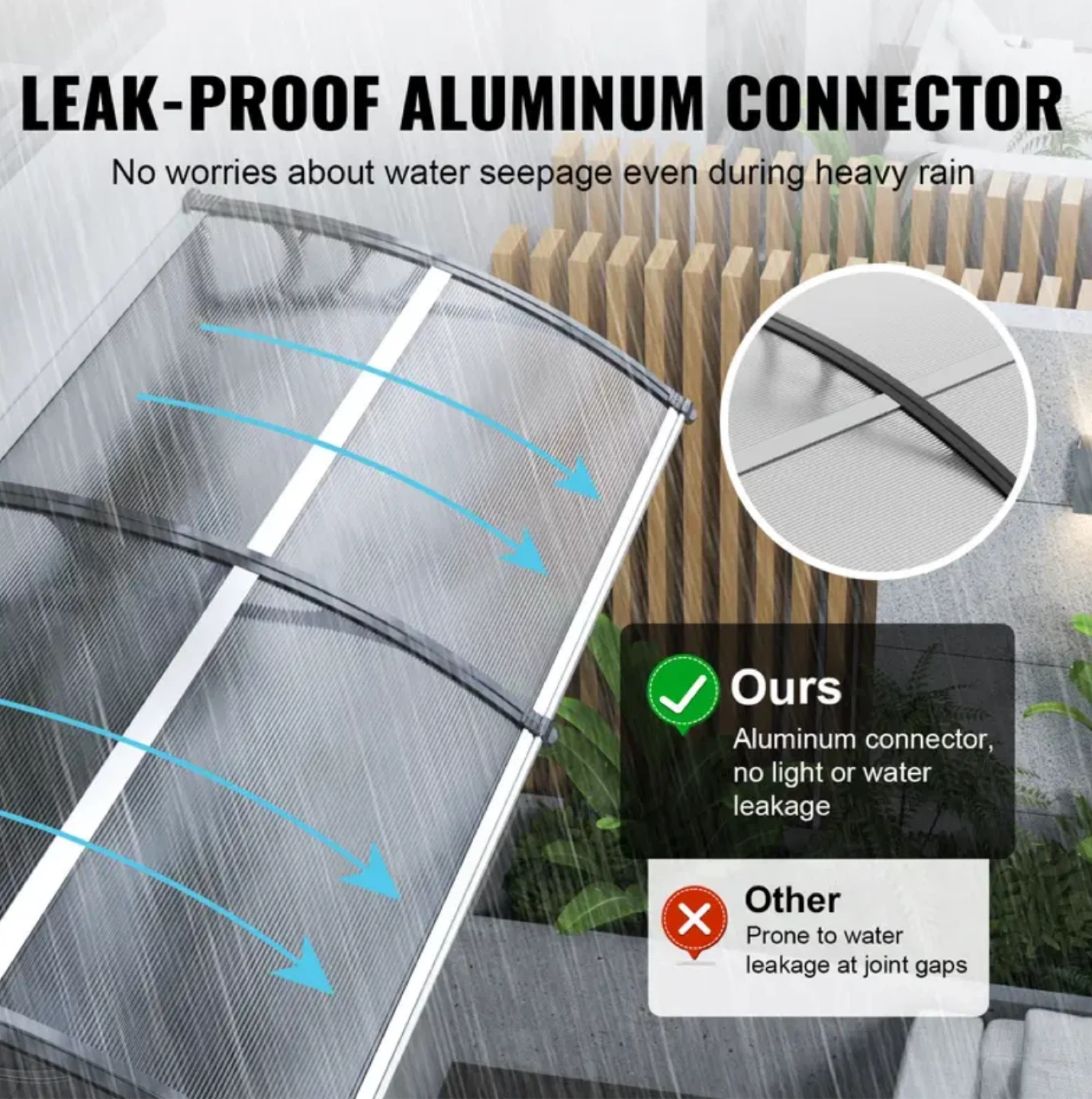 This door and window awning canopy features premium materials. It is waterproof (level 4) and sunproof (UF50+). The product size is 37.9 x 117.1 x 10.8 inches. Easy installation and modular design, perfect for home and outdoor decoration. Also features a leak-proof aluminum connector