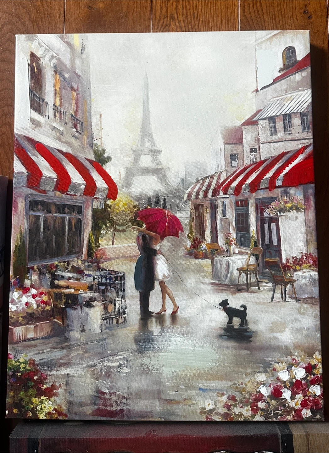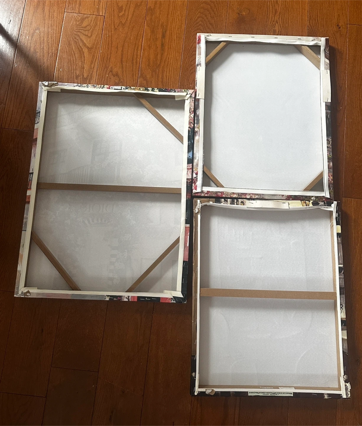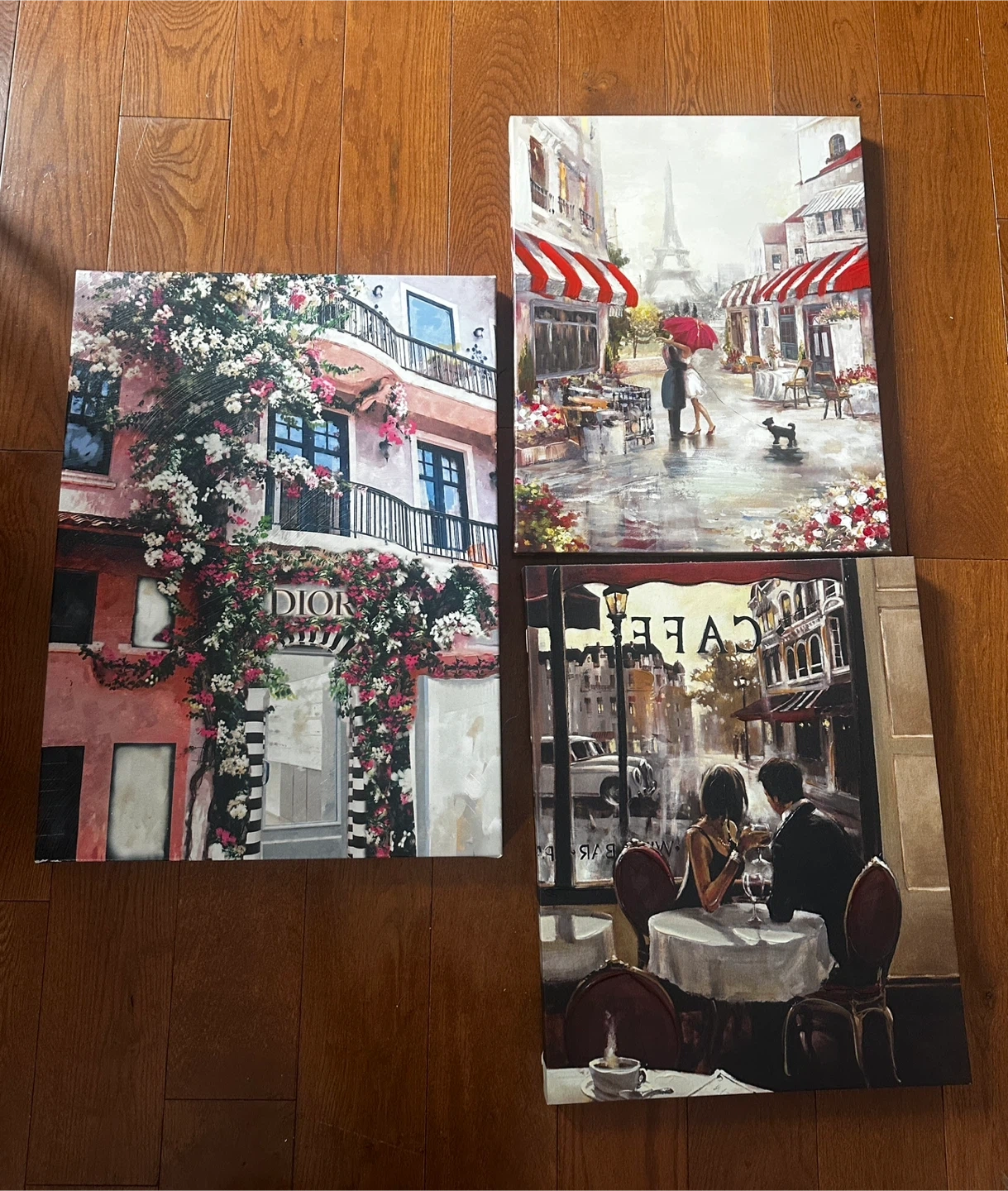 Selling a set of 3 canvas wall art pieces. One features a Parisian street scene with the Eiffel Tower in the background, and another showcases a Dior storefront covered in flowers. They're in great condition and ready to add a touch of style to your home!