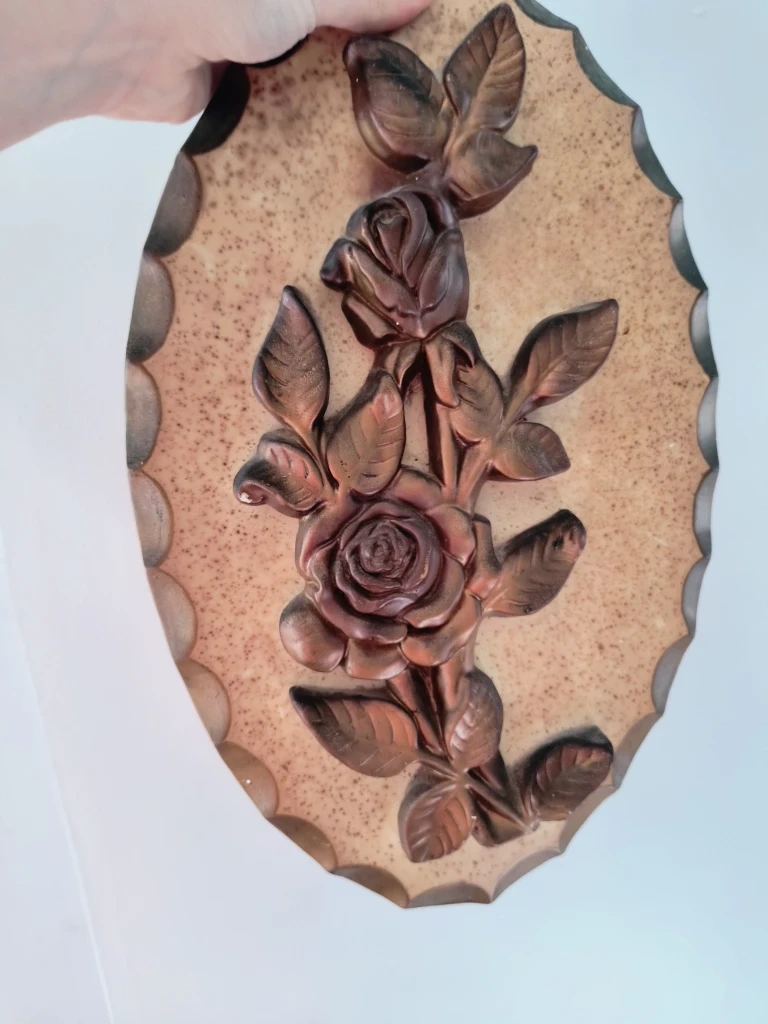 Selling a vintage floral wall decor piece. It features a beautiful rose design with leaves and has a unique oval shape with a scalloped edge. It's heavy, I believe its made from clay and painted with metallic covered paint.