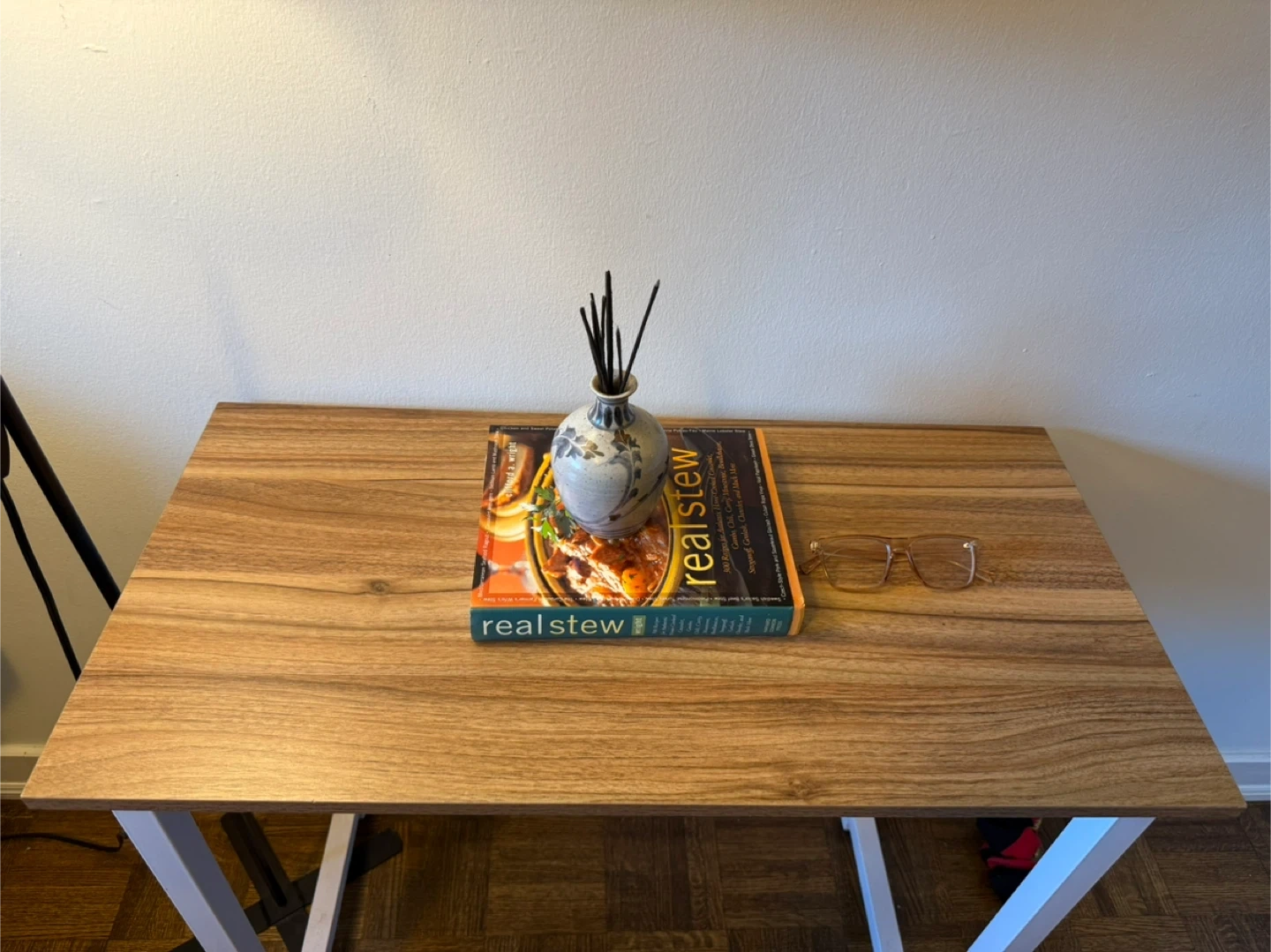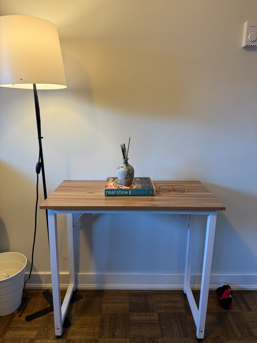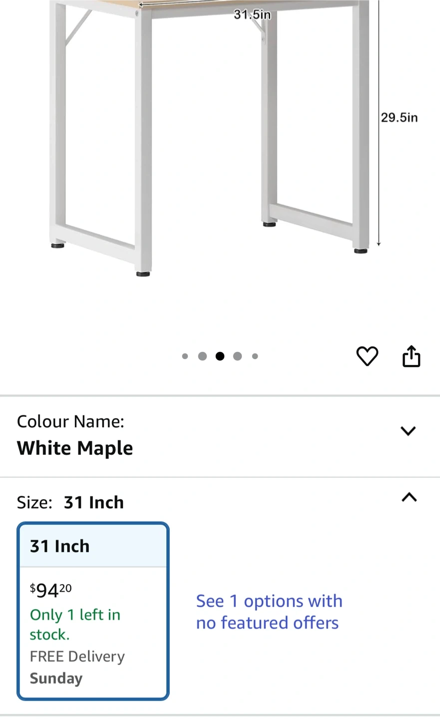 Selling a soges small computer desk in white maple. It's perfect for small spaces like a home office or bedroom. The desk has a modern, simple style and measures 31 inches. Dimensions are 31.5in length x 15.7in width x 29.5in height.