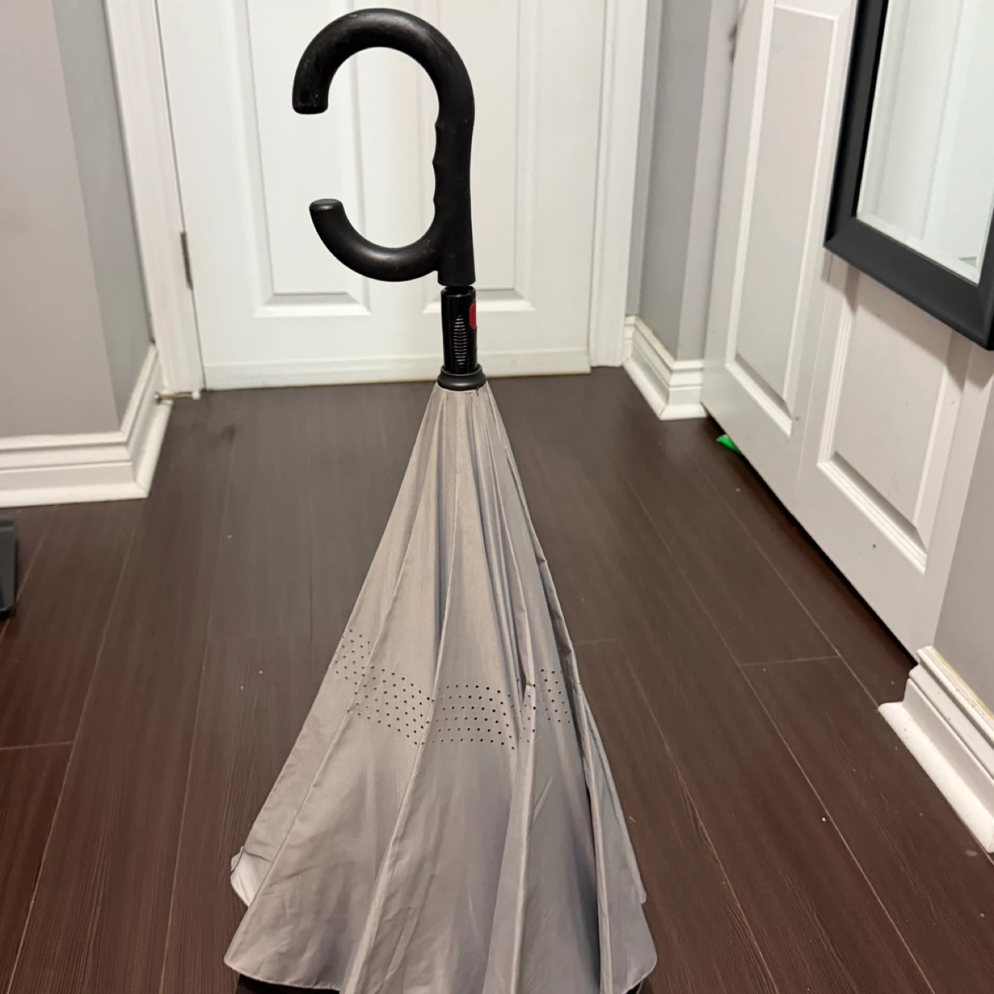 Selling a used inverted umbrella. It's designed to keep you dry when you close it, and the hands-free handle is super convenient! The colours are grey and black.