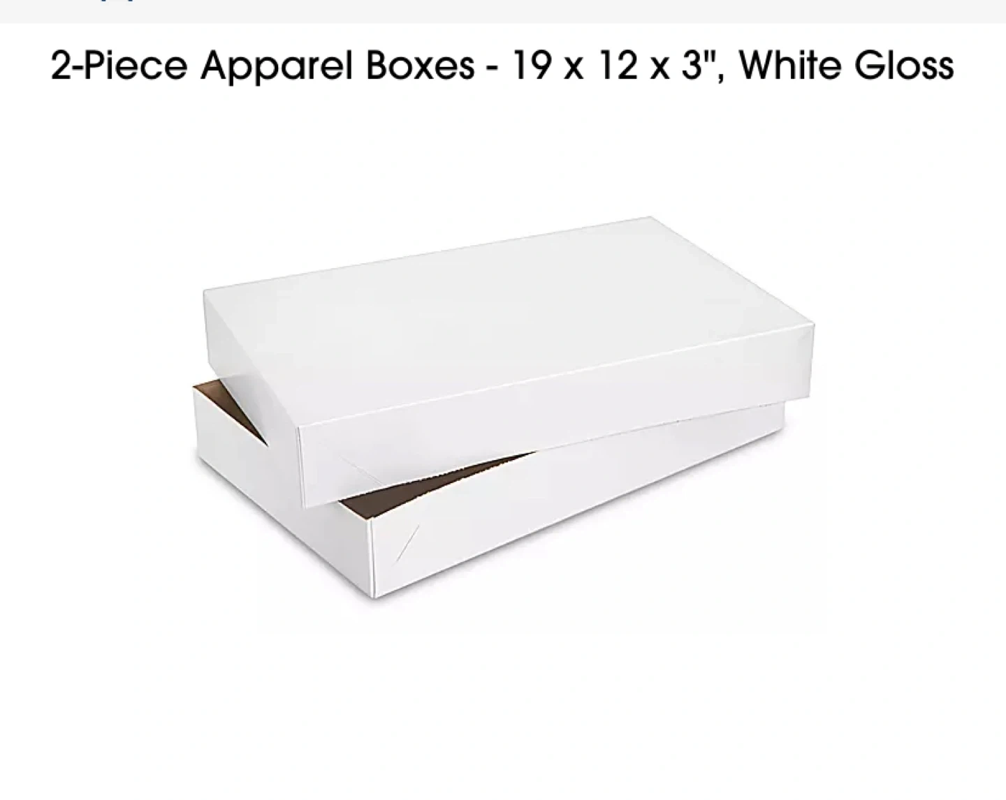 apparel boxes in a white gloss finish. These boxes measure 19 x 12 x 3 inches