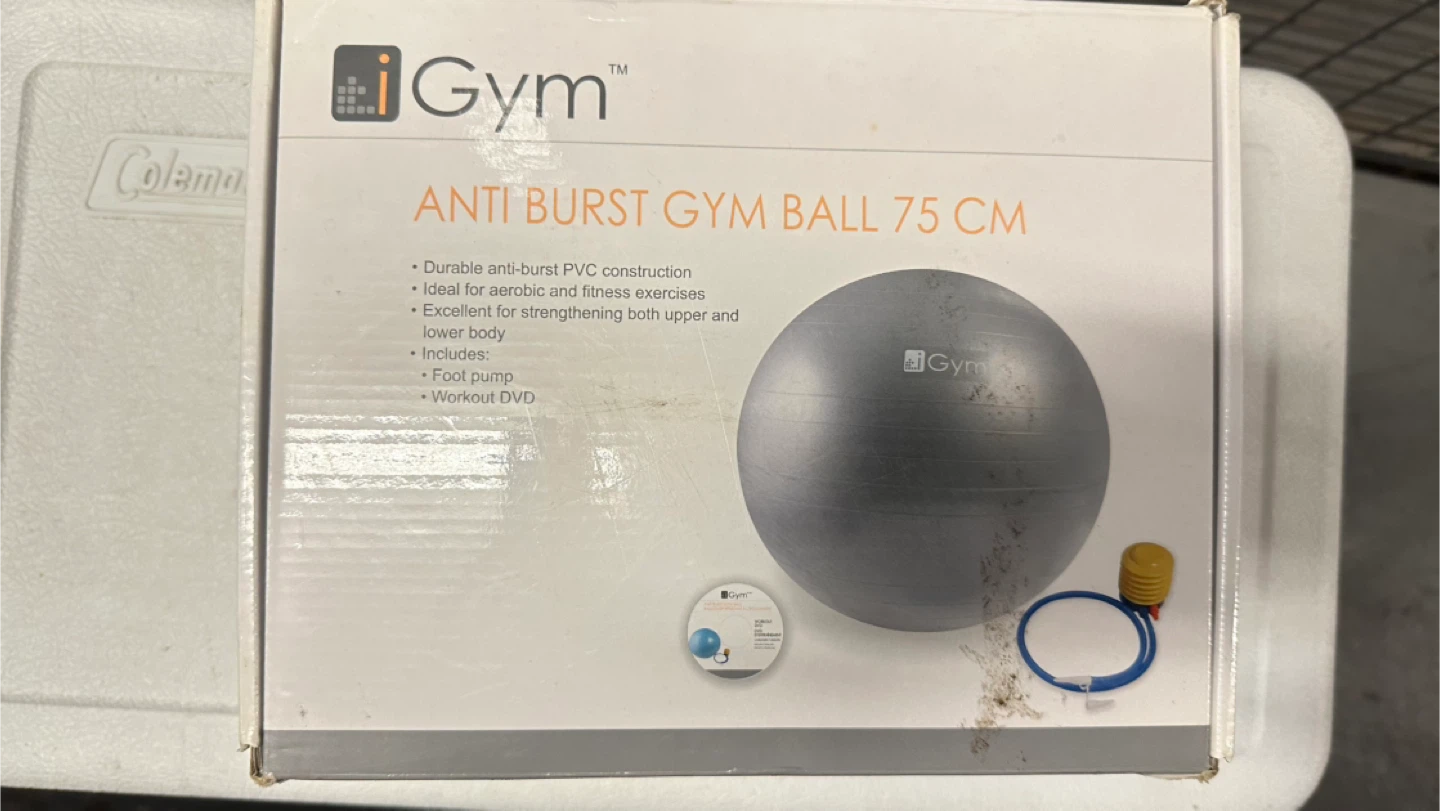Selling an iGym anti-burst gym ball, size 75 cm. It's in great condition and comes with a foot pump and workout DVD. The ball is made with durable anti-burst PVC construction, perfect for aerobic and fitness exercises. It's excellent for strengthening both upper and lower body. Comes in the original box!