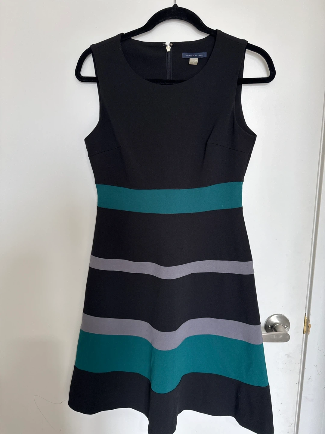 Selling a Tommy Hilfiger dress in size 4. It's a stylish piece with black, teal, and grey stripes. Great for any occasion!